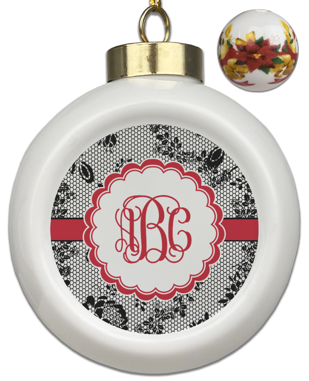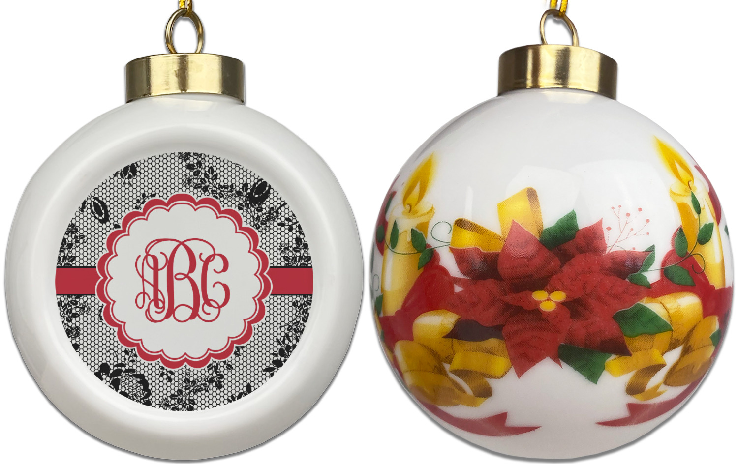 Our Christmas ornaments are a unique ceramic ball shape with a twist as it has a flat face to display your custom design! Select from one of our two design types - Christmas Tree or Poinsettia Garland - to adorn the curved back of your personal design. Each ornament measures 3H x 2.5W x 2D accompanied with a gold string accent for finishing touches to hang on your beautiful Christmas tree!