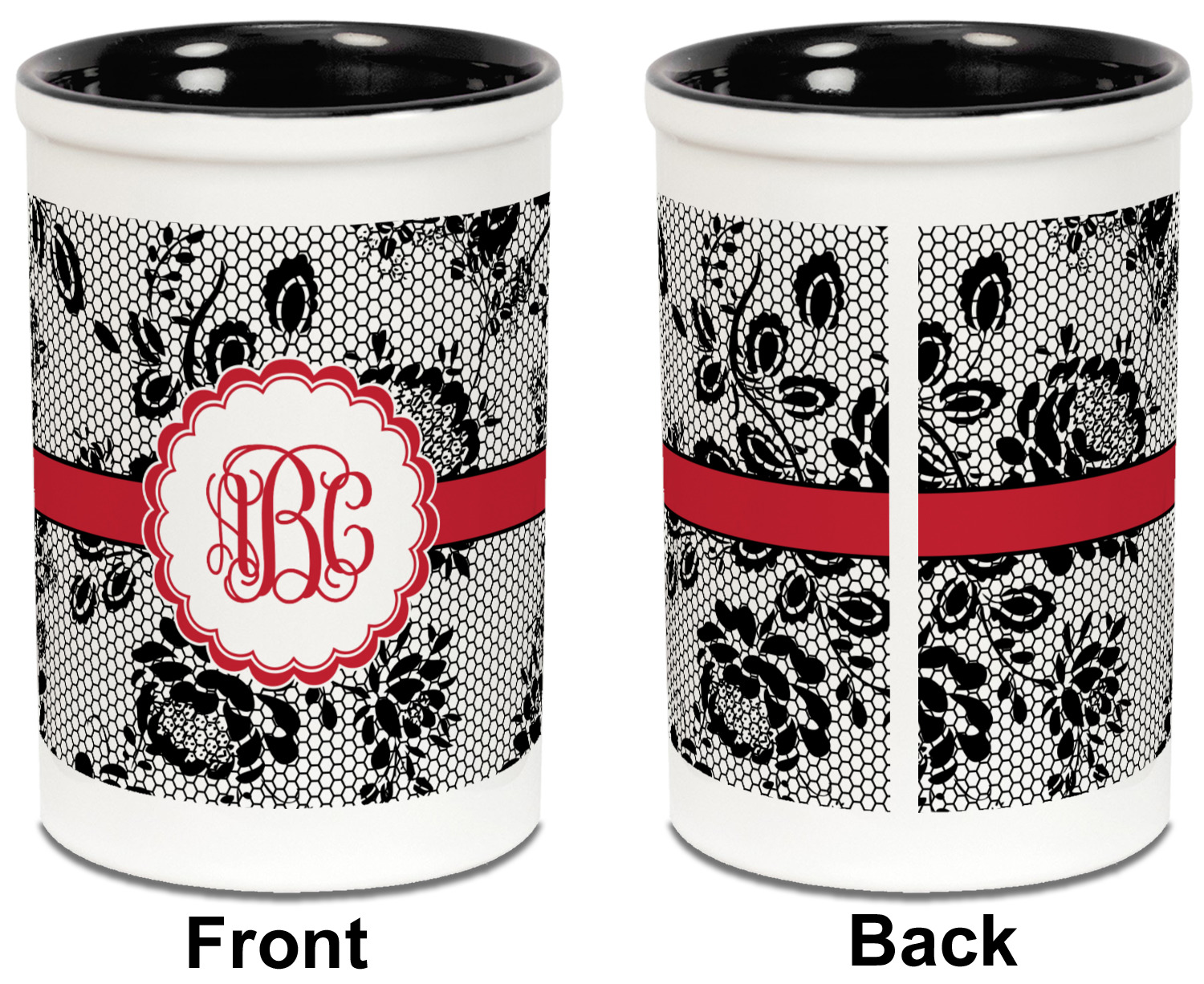 Both the blue and black pencil holders are a ceramic material, giving you a sturdy and long-lasting pen and pencil holder. We print your designs on the exterior of the pencil cup, covering most of the outside surface. There is a small white border on the top and bottom of the exterior of the pen holder, setting apart your design from the interior's color. Our ceramic pen caddy is roughly 3.5" x 3.5" x 5" in dimensions.