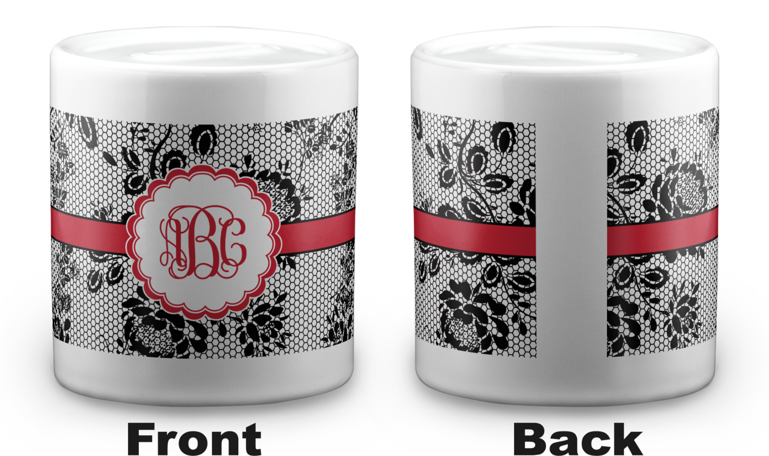 A wide red band with a thin white outline adds a punch of color. The scalloped label highlights a classic personalized monogram.
