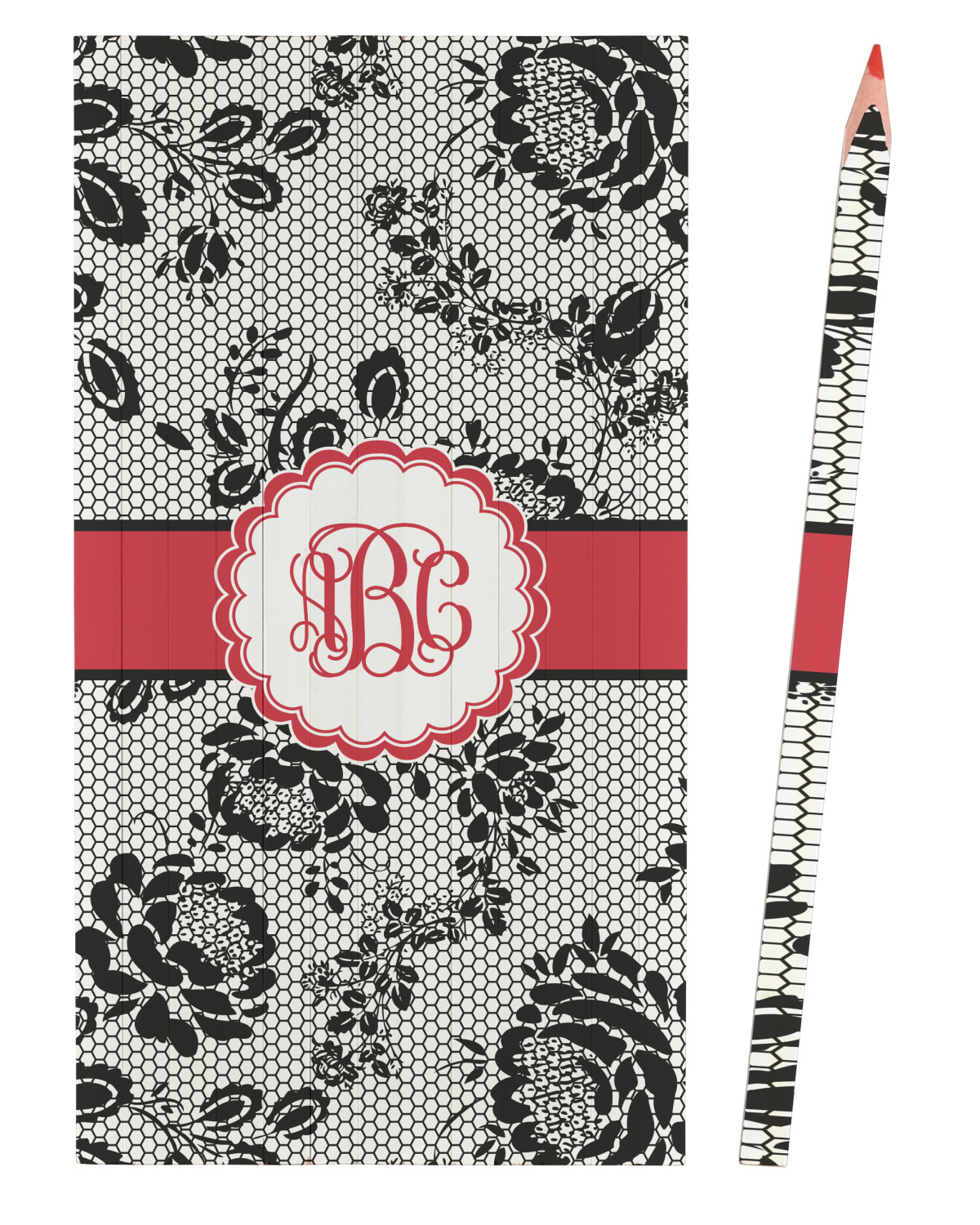 A wide red band with a thin white outline adds a punch of color. The scalloped label highlights a classic personalized monogram.