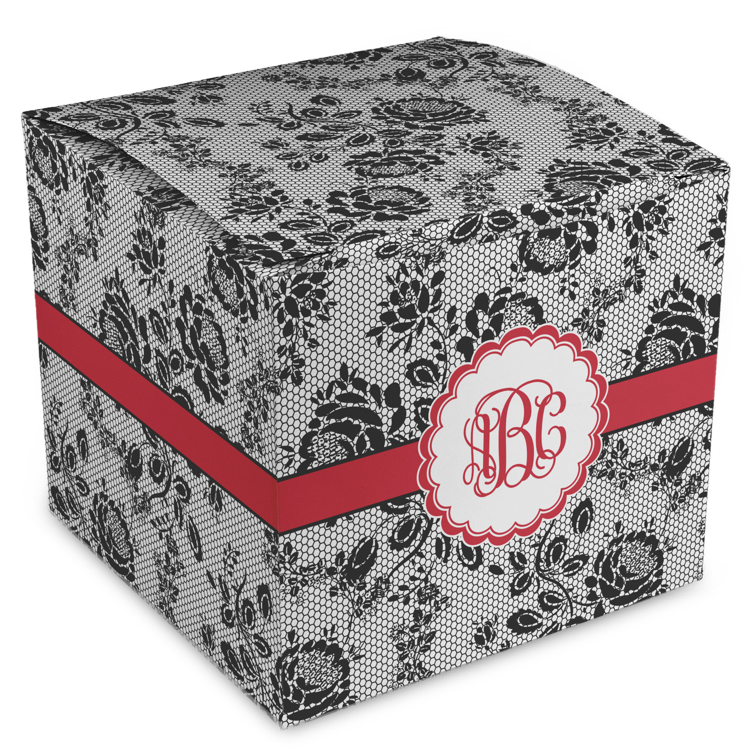 A wide red band with a thin white outline adds a punch of color. The scalloped label highlights a classic personalized monogram.