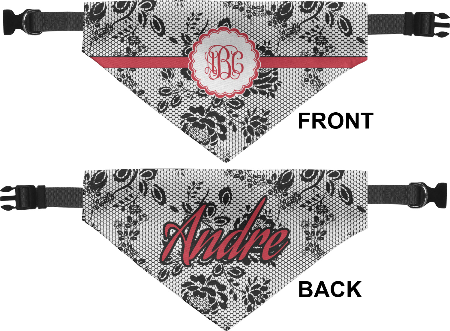 We print the front and back of these dog bandanas with your customized design. The bandana itself is made from a durable polyester, sewn together with a gap large enough to accommodate any collar. Regardless, the bandana includes a plain black, canvas collar with plastic snaps, that can easily be removed if desired. These dog bandana collars are available in four sizes: small, medium, large, and extra large. Please see our sizing chart for more information regarding the dimensions of each size.