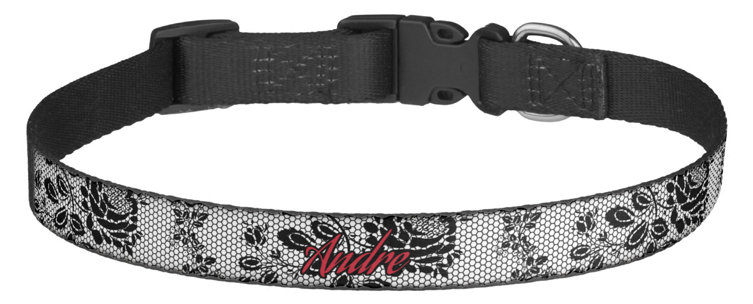 This sturdy collar, made from a durable nylon weave, will outlive your dog's episodes of excited tugging and pulling. Courtesy of its thick plastic buckle and adjuster, this collar is adjustable and accommodating of any dog. Structurally, the collar is a single piece of nylon weave that is sewn together, and features a solid metal loop where you can attach a leash or dog tag. We print and display your dog's name and pattern across the middle of the personalized dog collar.