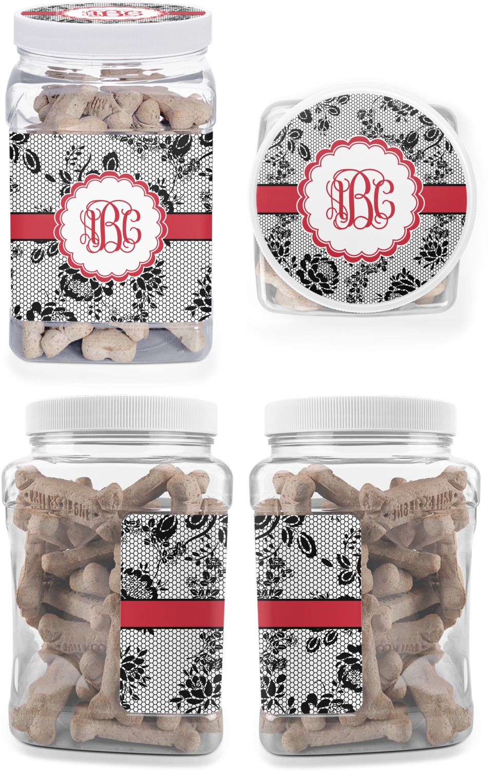 This half gallon jar, made from a sturdy plastic, is the perfect way to keep treats from any naughty pet paws, while still keeping them ready on hand for when your pup performs an impressive trick. This dog cookie jar features a screw-on, white lid that displays your personalized design on a vinyl sticker. We apply another customized sticker that wraps around the front and sides of the jar. Our dog treat jar also has indentations on the rear ends of the sides, which allows for convenient handling, and its square frame allows for easy storage.