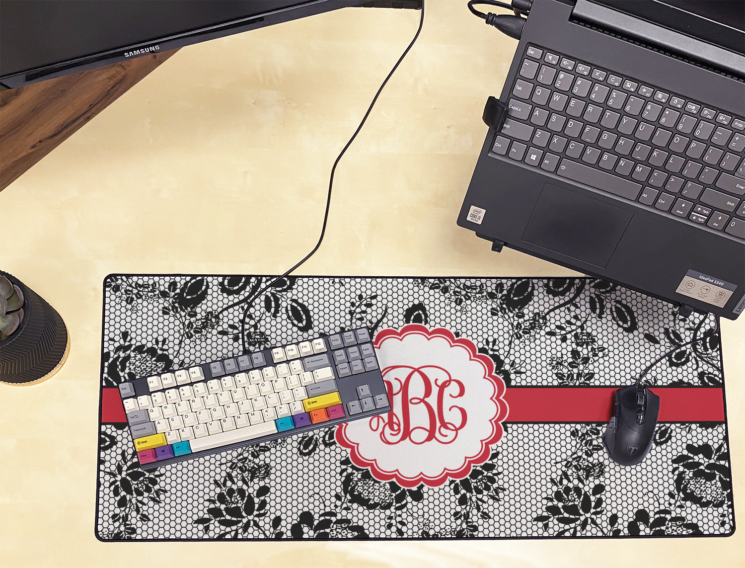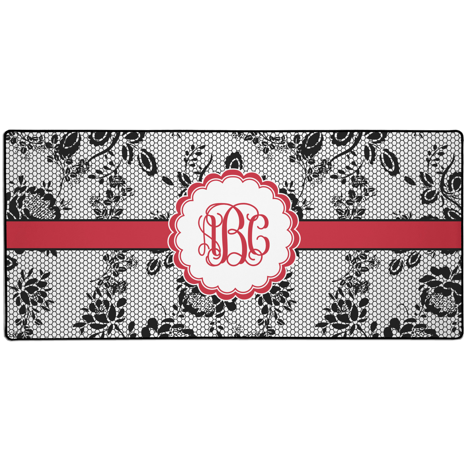 A wide red band with a thin white outline adds a punch of color. The scalloped label highlights a classic personalized monogram.