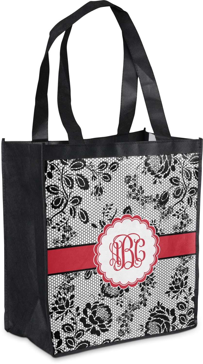 Made from a durable, biodegradable material, these reusable shopping bags can support up to 30 pounds of weight. With two large handles, measuring at 8.5 inches each, these personalized tote bags are easy to carry to your vehicle or home. The bag itself is 12 by 13.5 inches, and can expand to a depth of 7 inches. Your customization is printed on both the front and back, while the remaining sides, trim, and handle are a sleek, charcoal black.