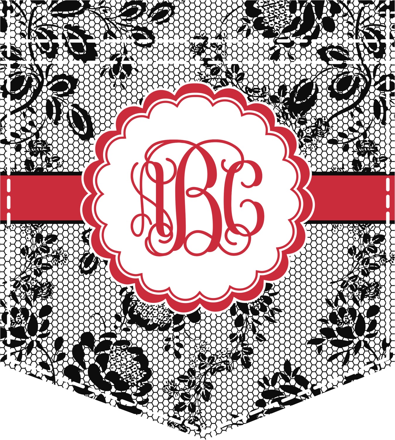 A wide red band with a thin white outline adds a punch of color. The scalloped label highlights a classic personalized monogram.
