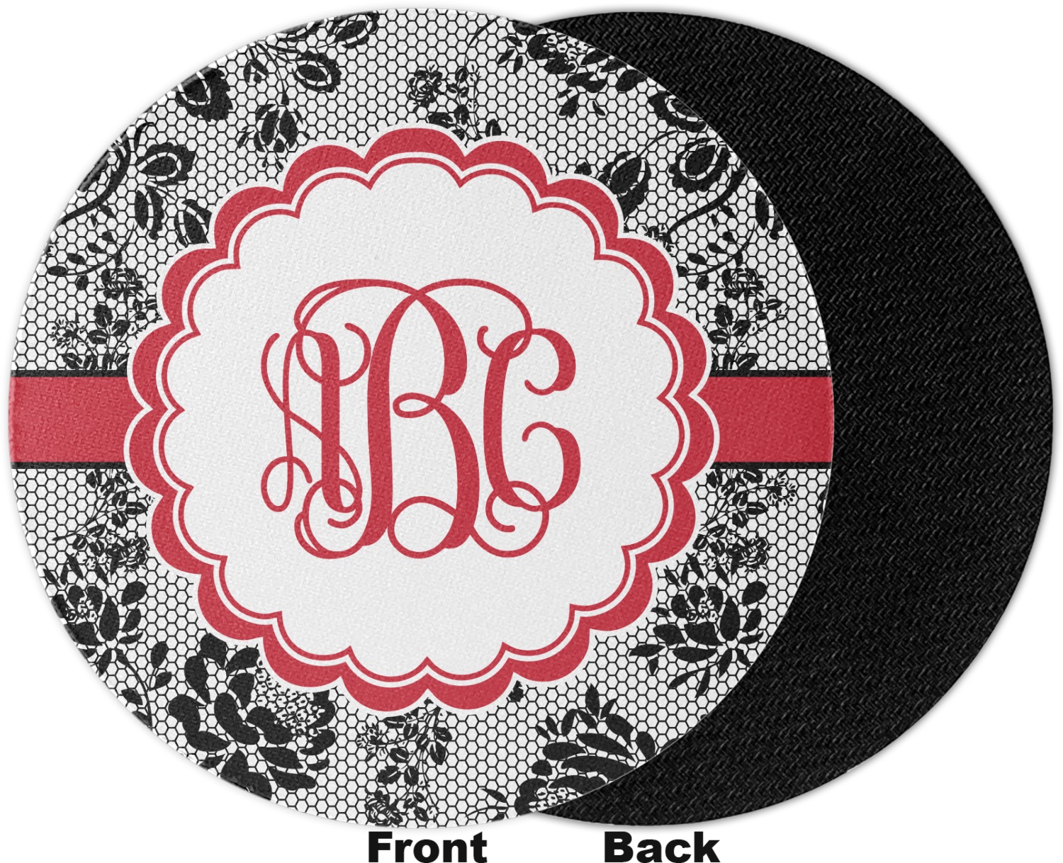 A wide red band with a thin white outline adds a punch of color. The scalloped label highlights a classic personalized monogram.