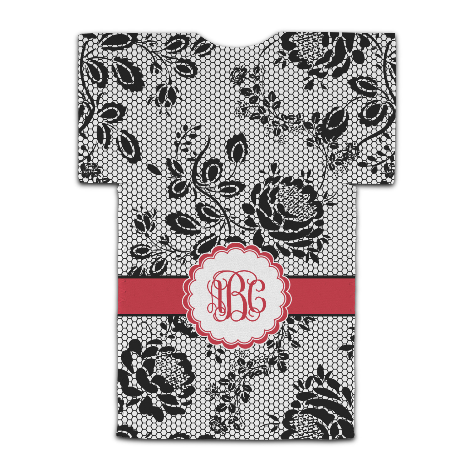 A wide red band with a thin white outline adds a punch of color. The scalloped label highlights a classic personalized monogram.