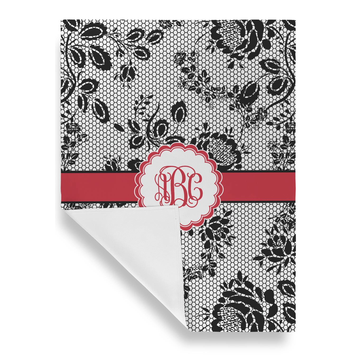 A wide red band with a thin white outline adds a punch of color. The scalloped label highlights a classic personalized monogram.