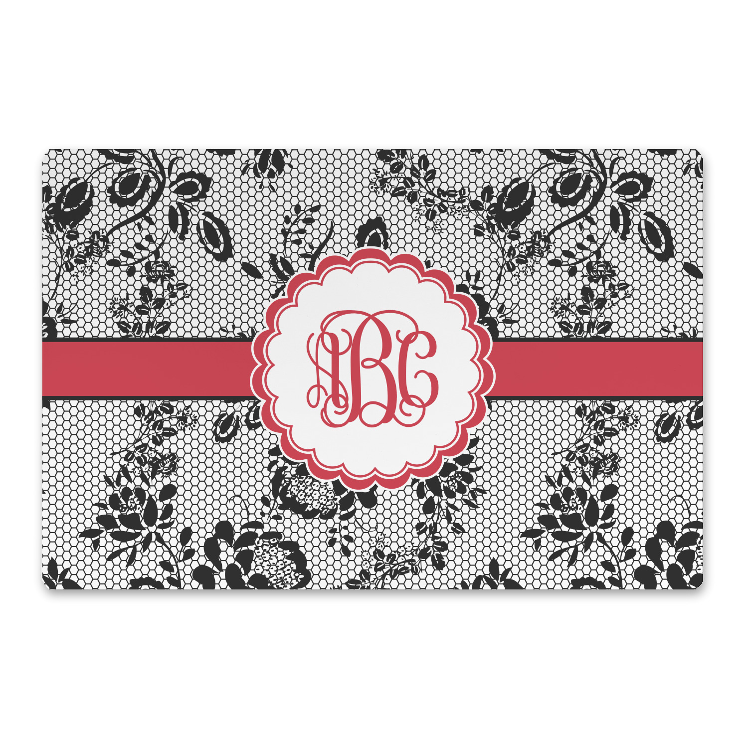 A wide red band with a thin white outline adds a punch of color. The scalloped label highlights a classic personalized monogram.