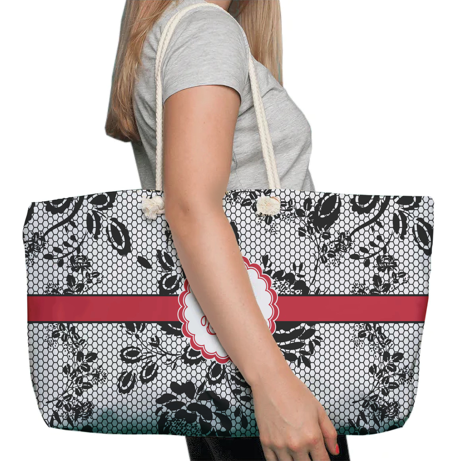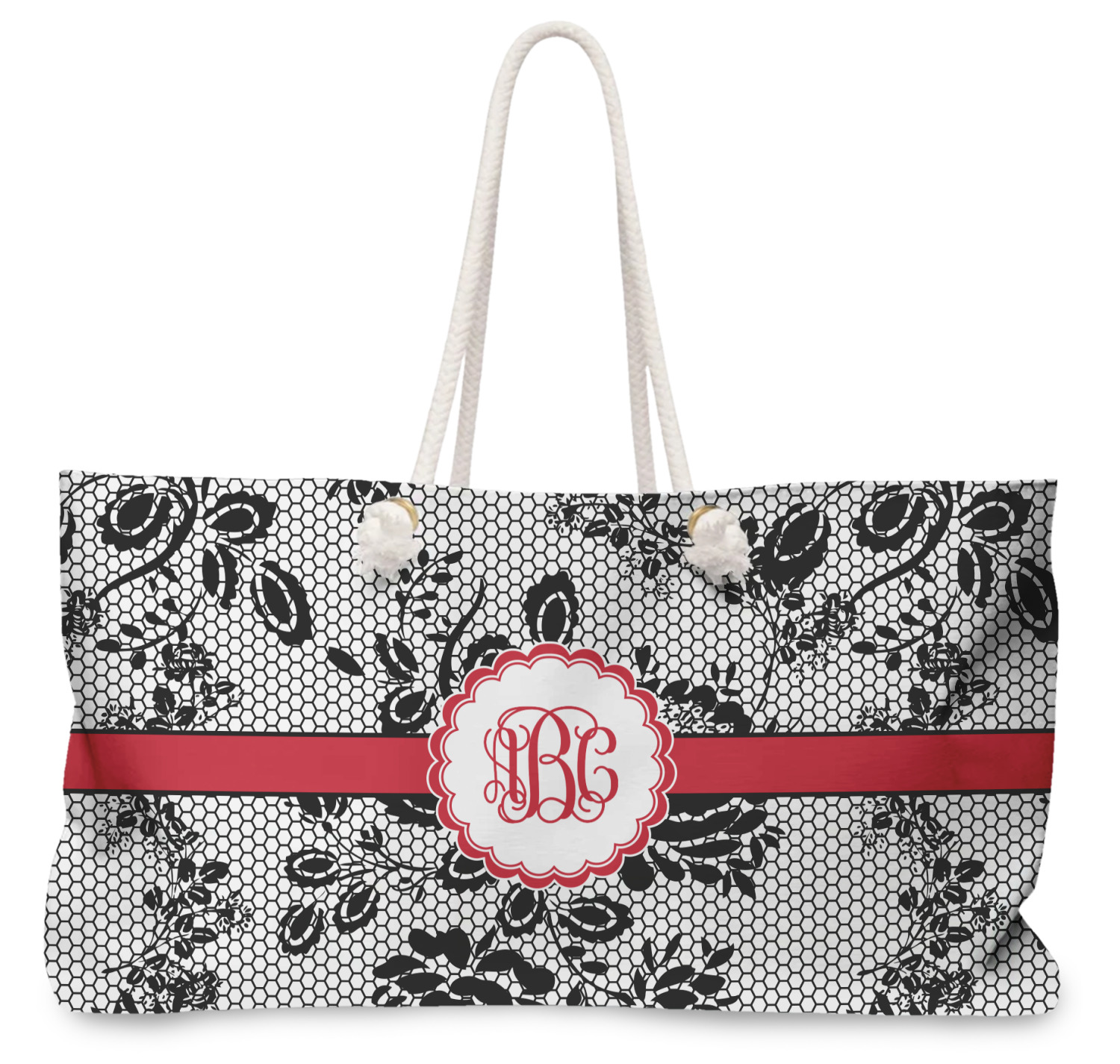 Our oversized weekender tote with rope handles is perfect for your weekend at the beach or on the town. This large tote are 24" W X 13" H, with a 5" gusset and a 27" thick rope handles with a knot that is put through a grommeted brass hole.