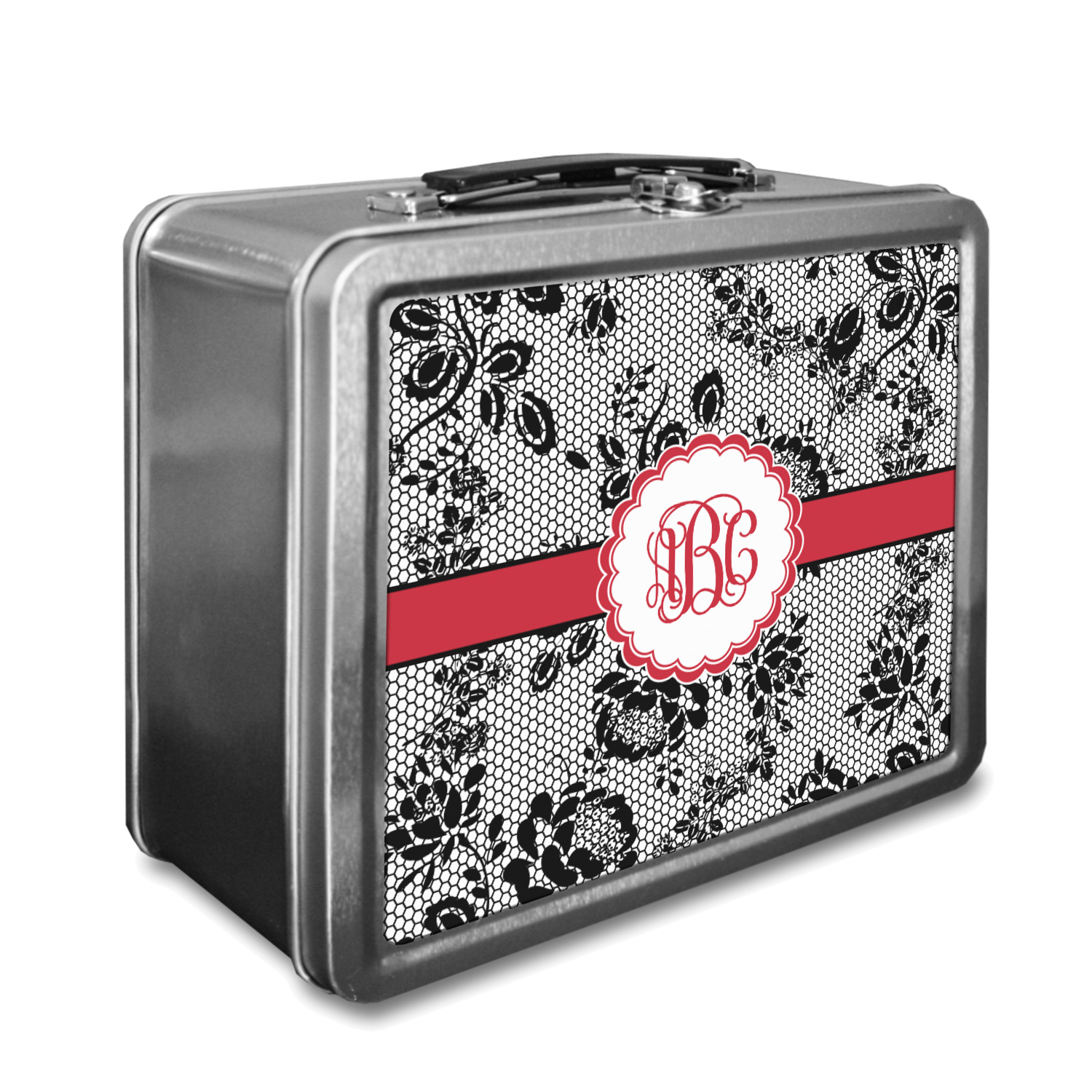 These metal lunch containers have a silver finish and are accompanied by a collapsible, black, plastic handle and a metal, latch closure. The box itself measures at 7.75 by 6.75 inches, while the interior is 4 inches deep. The metallic character of this personalized lunch box , along with its retro design, is a subtle tribute to the old days.