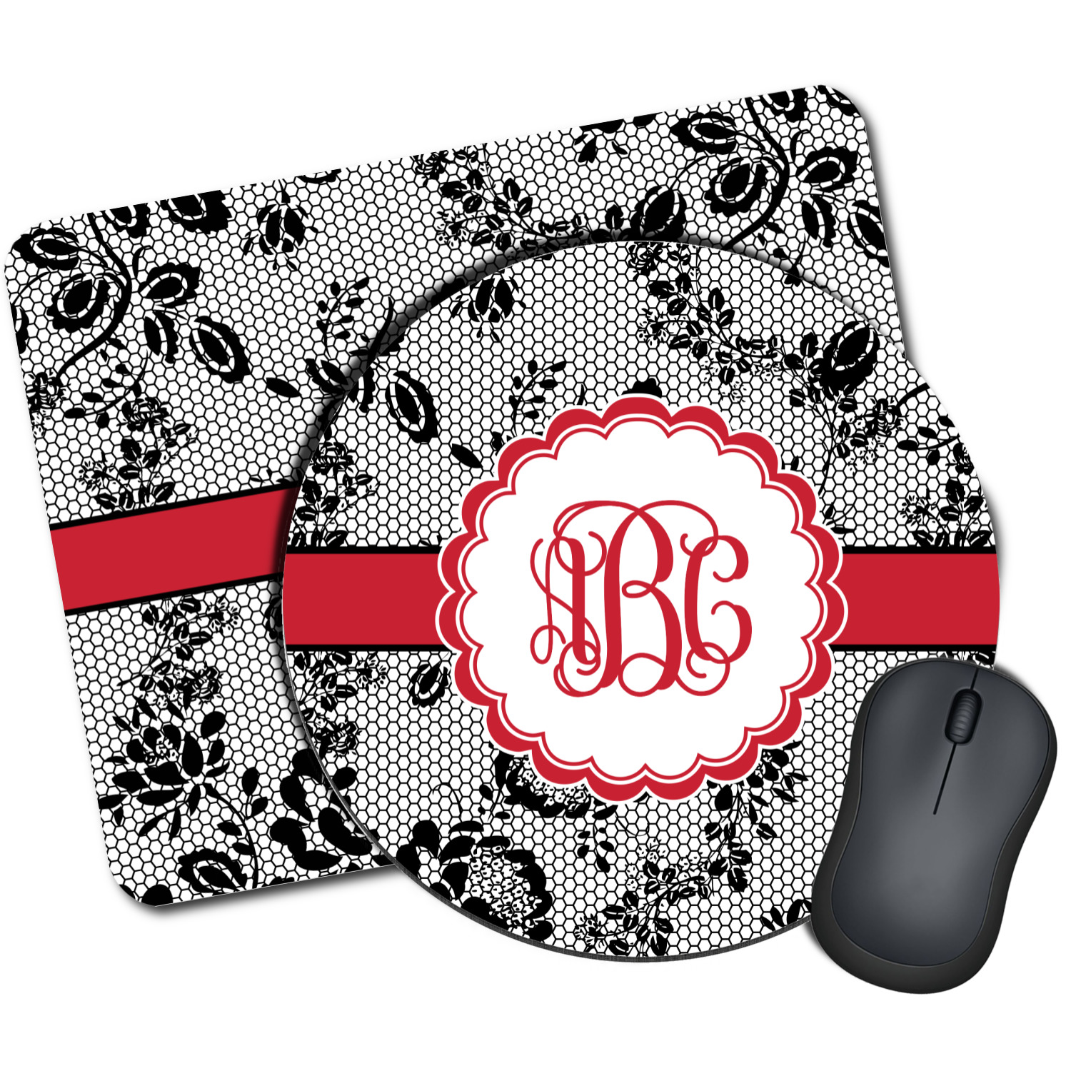 A wide red band with a thin white outline adds a punch of color. The scalloped label highlights a classic personalized monogram.