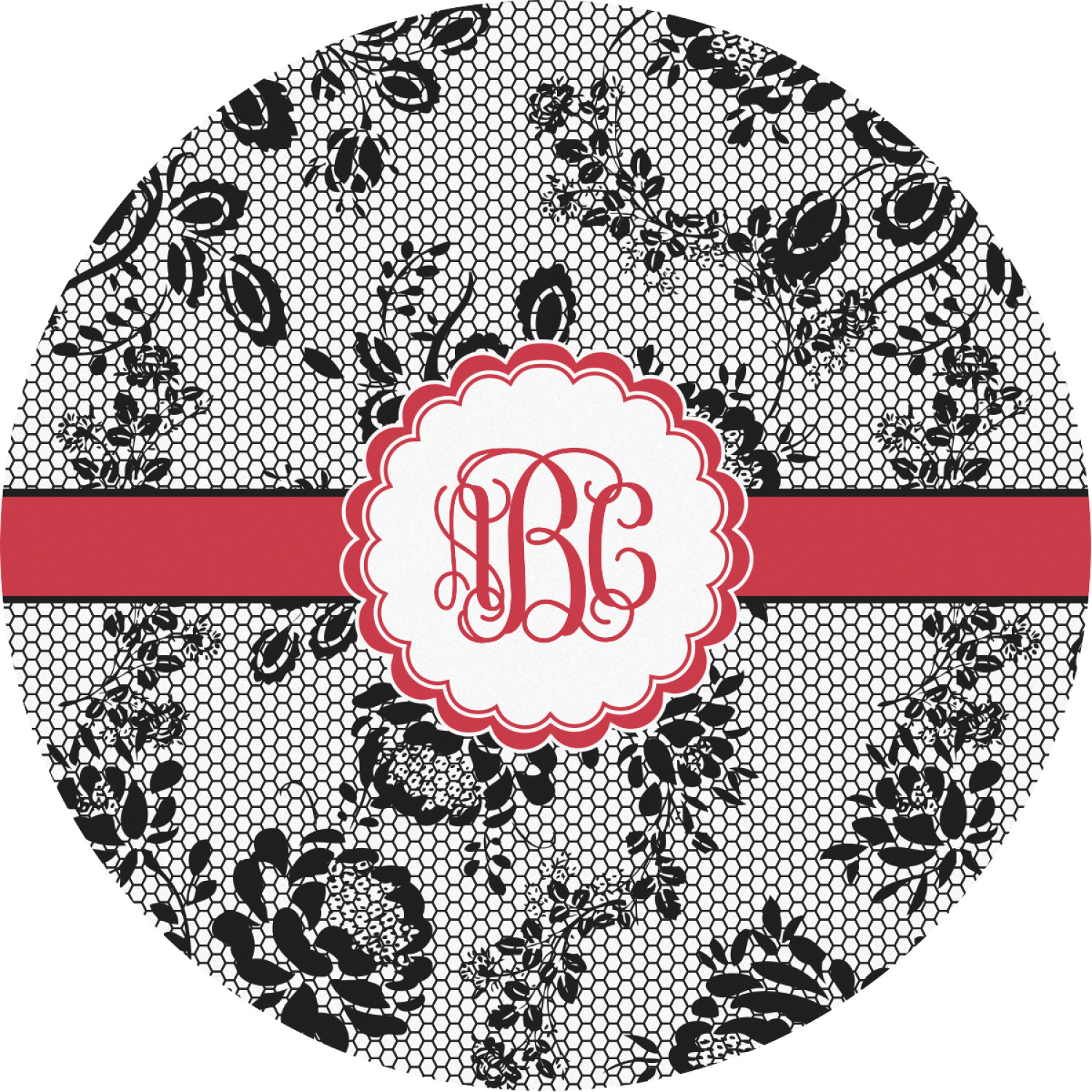 A wide red band with a thin white outline adds a punch of color. The scalloped label highlights a classic personalized monogram.