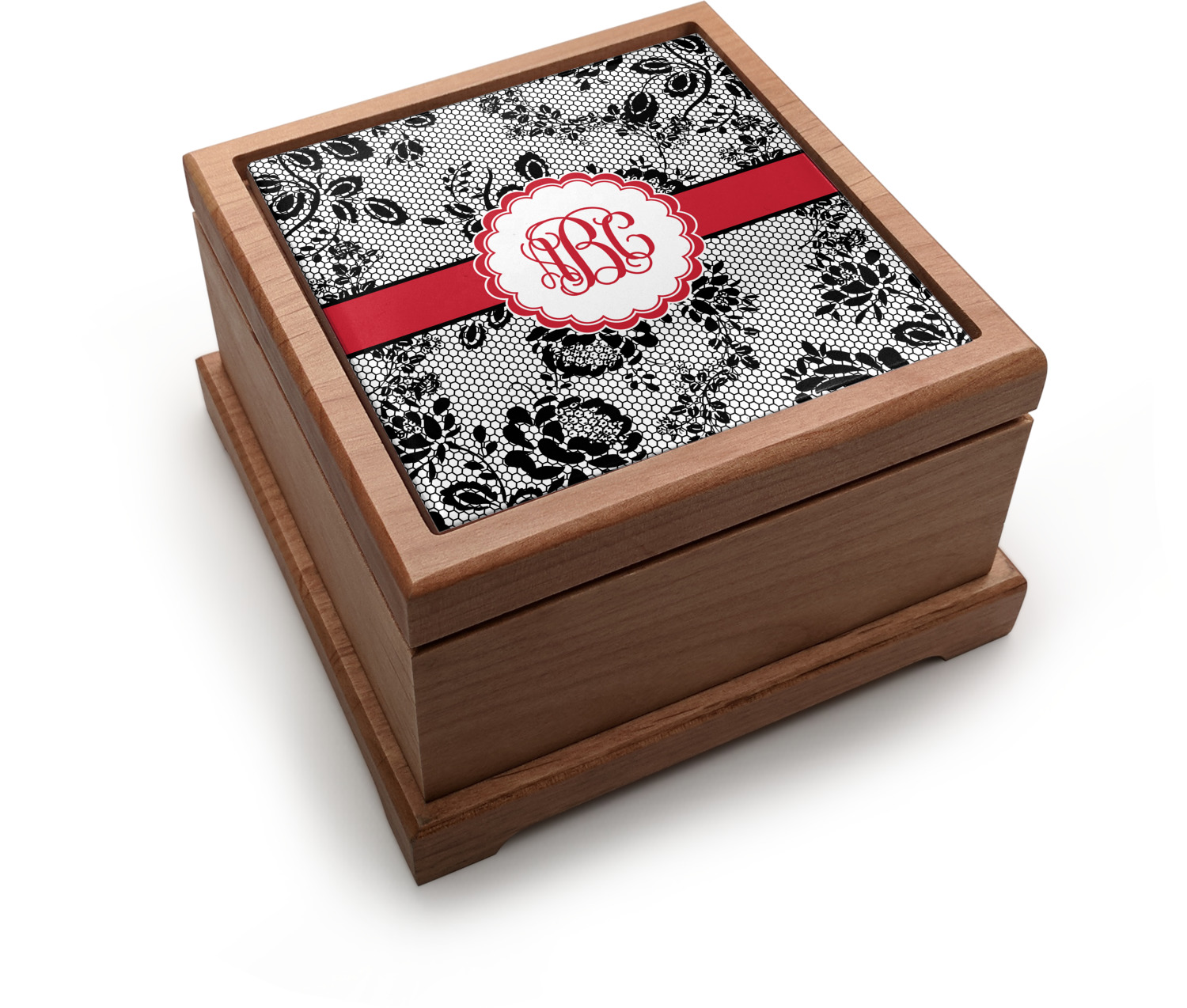 A wide red band with a thin white outline adds a punch of color. The scalloped label highlights a classic personalized monogram.