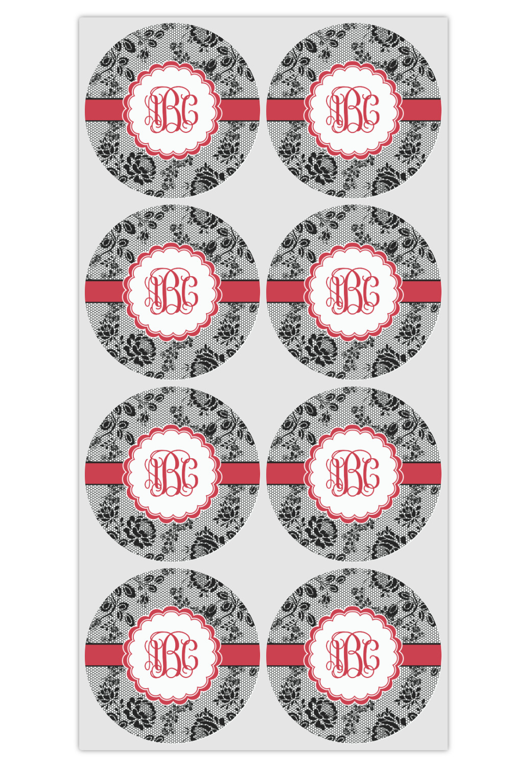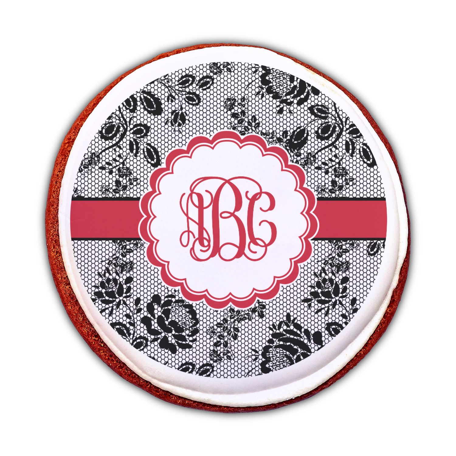 A wide red band with a thin white outline adds a punch of color. The scalloped label highlights a classic personalized monogram.
