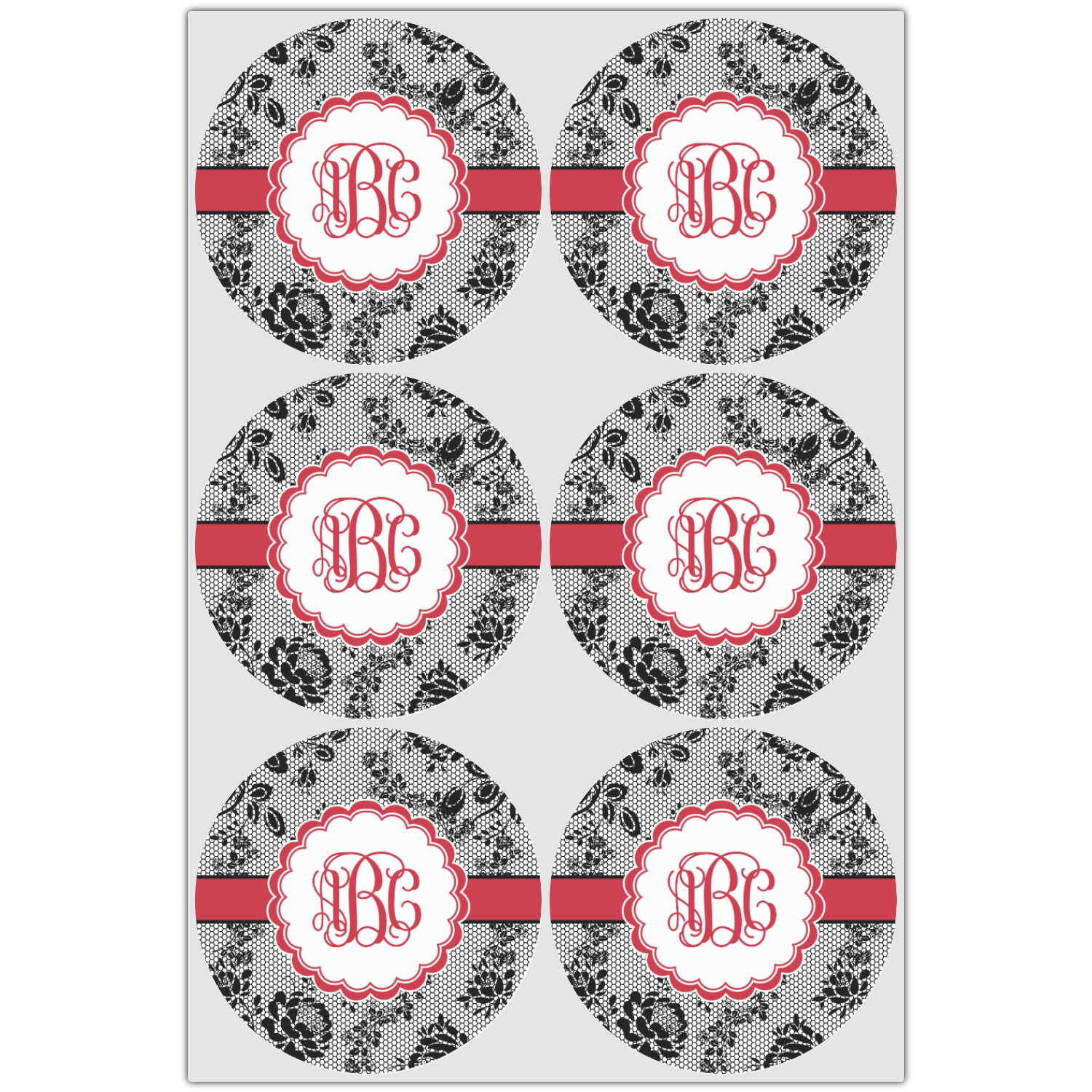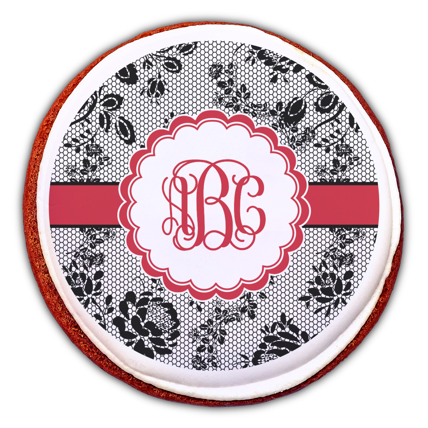 A wide red band with a thin white outline adds a punch of color. The scalloped label highlights a classic personalized monogram.
