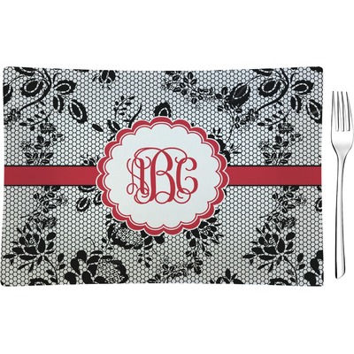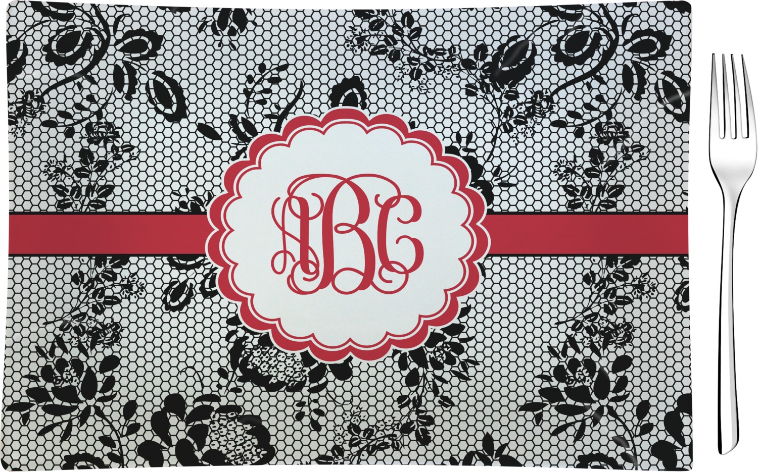 A wide red band with a thin white outline adds a punch of color. The scalloped label highlights a classic personalized monogram.