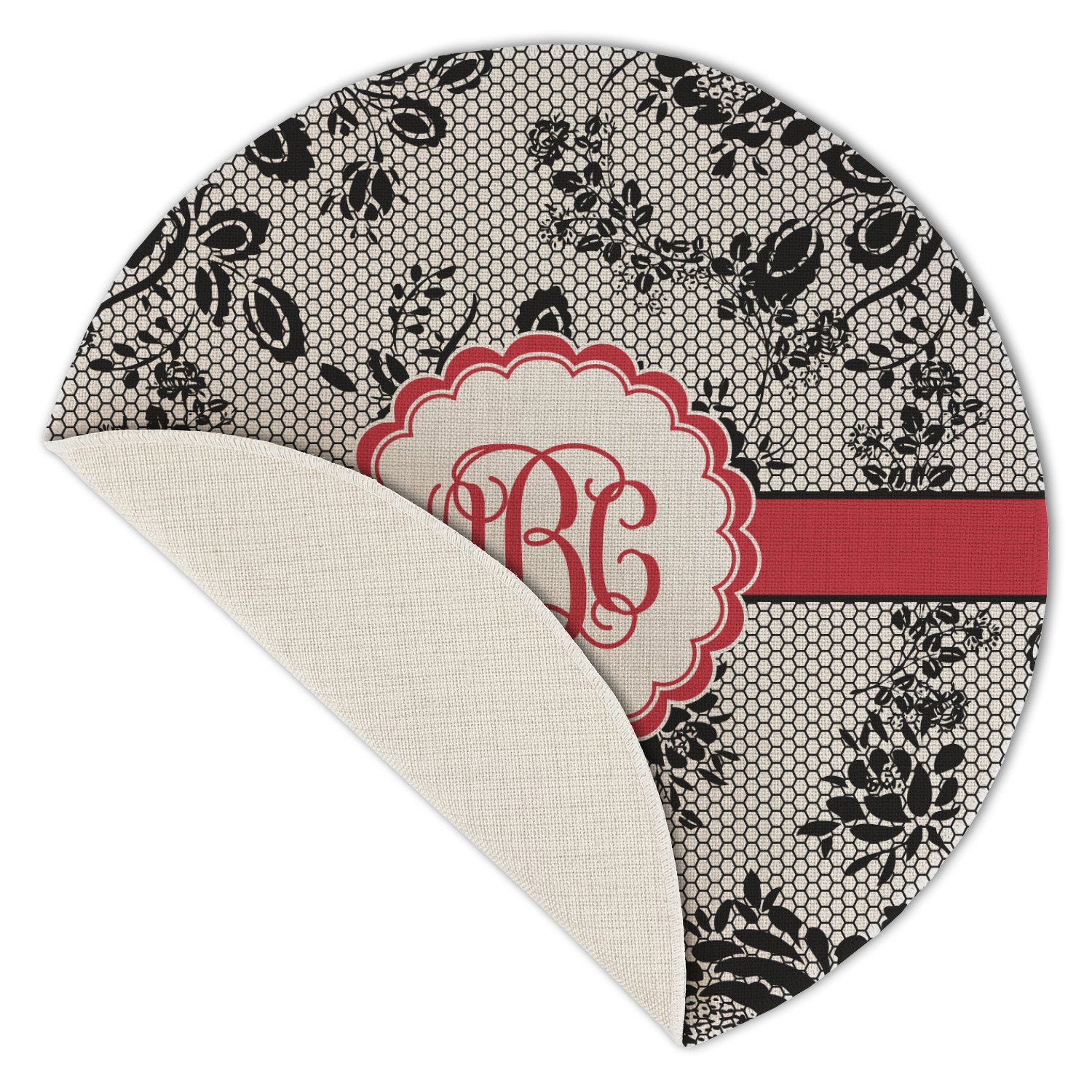 A wide red band with a thin white outline adds a punch of color. The scalloped label highlights a classic personalized monogram.