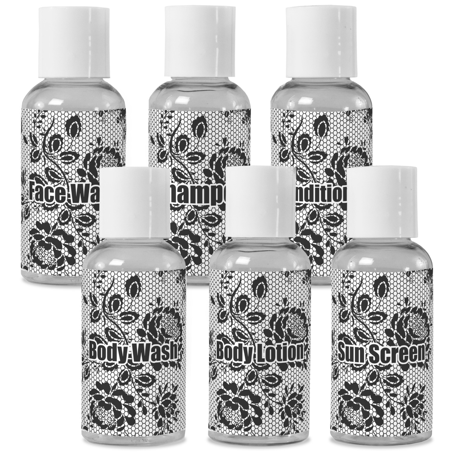 These soap and lotion travel bottles are the perfect place to start. Each set comes with 6 clear plastic bottles with white pop top lids. The bottles are cylindrical and can hold approximately 2.7oz. Perfect for plane travel!