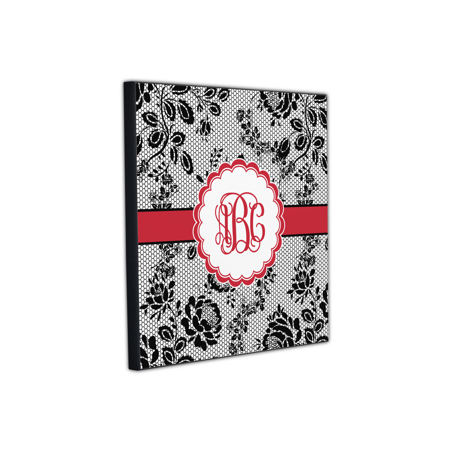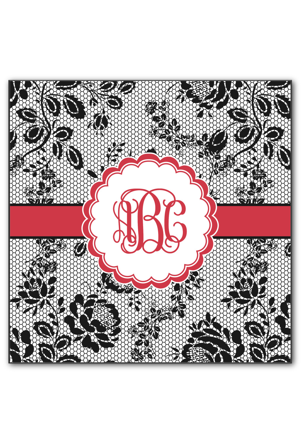 A wide red band with a thin white outline adds a punch of color. The scalloped label highlights a classic personalized monogram.