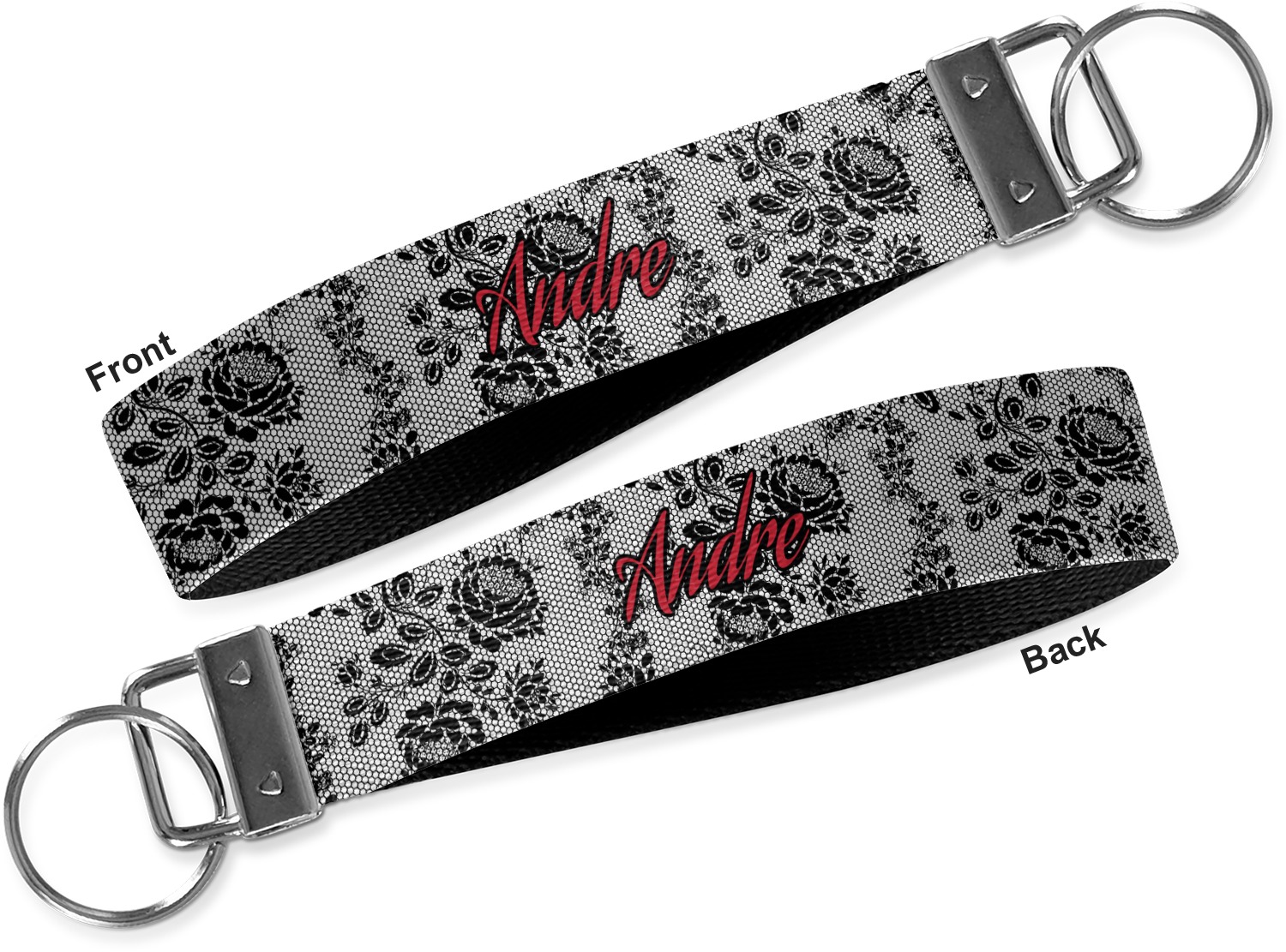 These key fob keychains are made from a polyester weave, right here in the USA. They feature a silver, metal clasp, attached to a round keyring. The piece gives the personalized wristlet a beautiful, finished look. Your customized design is printed on the outside of the keychain strap. We carry these wristlets in two sizes: small, which is 5 inches in width, and large, which is 5.5 inches in width.