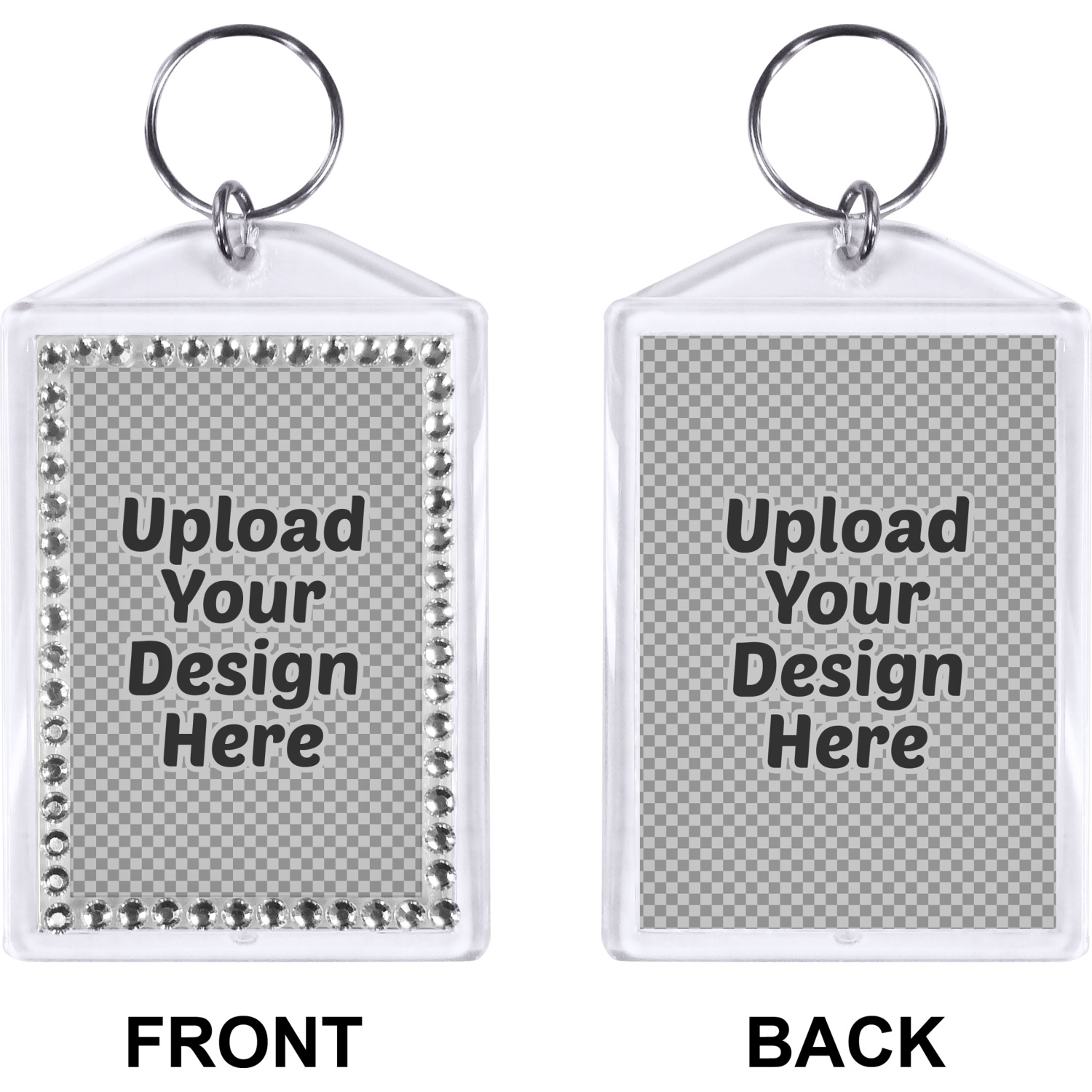 Our personalized keychains have a bold, rectangular shape, outlined by a series of shimmering rhinestones. A metal, split keyring is included with your purchase, and an additional metal hoop allows for attachment of the keychain to the split ring. This unique keychain measures at about 3.75 by 2.5 inches. We print your customized design(s) across both the back and front of this keychain.