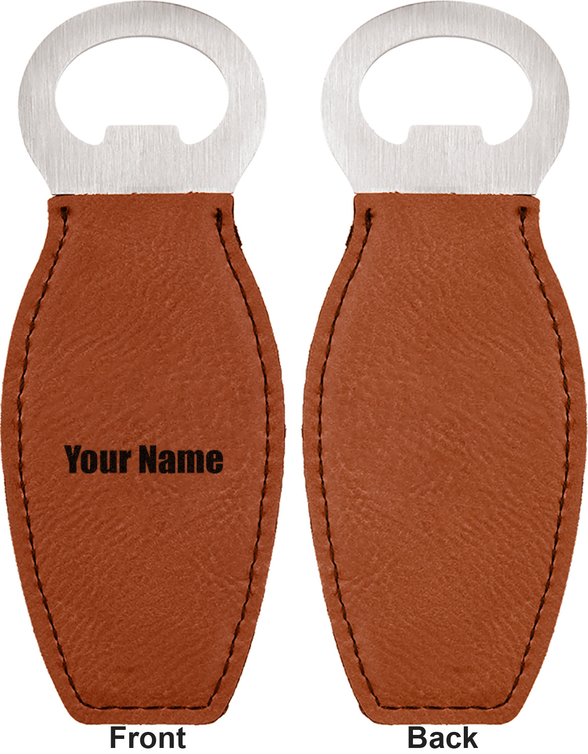 Built from stainless steel, these custom bottle openers are wrapped in a cognac-colored leatherette. Sharp, black stitching lines the edges for extra durability and a finished touch. Your personalization is laser-engraved onto the surface of this leatherette, leaving behind a crisp, black coloration. At 4.6 by 1.8 inches, this beer bottle opener gives you much of leverage when trying to open a stubborn bottle. On the opposite end of the opener, you'll find a magnet that you can use to display your new, unique bottle opener!