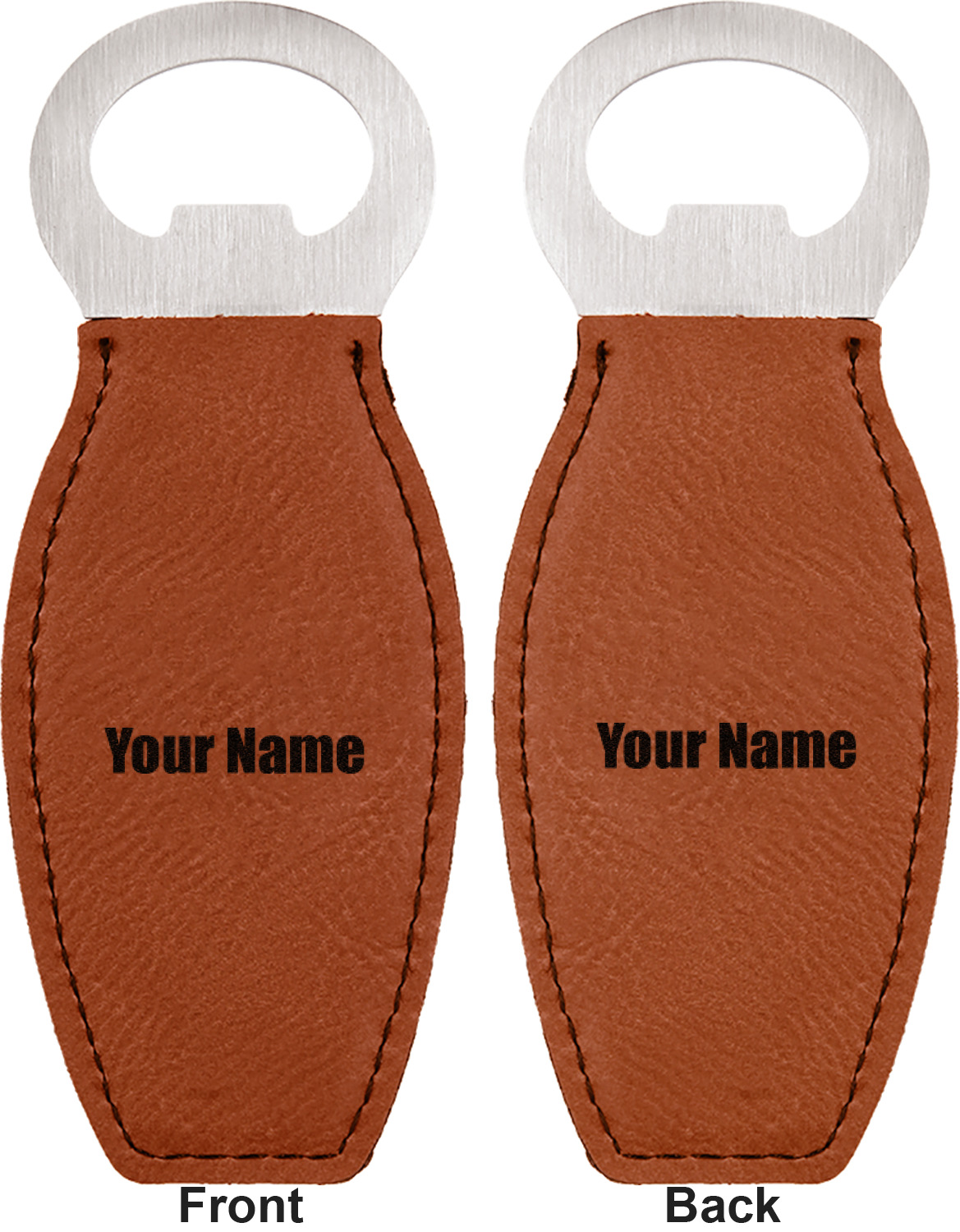 Built from stainless steel, these custom bottle openers are wrapped in a cognac-colored leatherette. Sharp, black stitching lines the edges for extra durability and a finished touch. Your personalization is laser-engraved onto the surface of this leatherette, leaving behind a crisp, black coloration. At 4.6 by 1.8 inches, this beer bottle opener gives you much of leverage when trying to open a stubborn bottle. On the opposite end of the opener, you'll find a magnet that you can use to display your new, unique bottle opener!