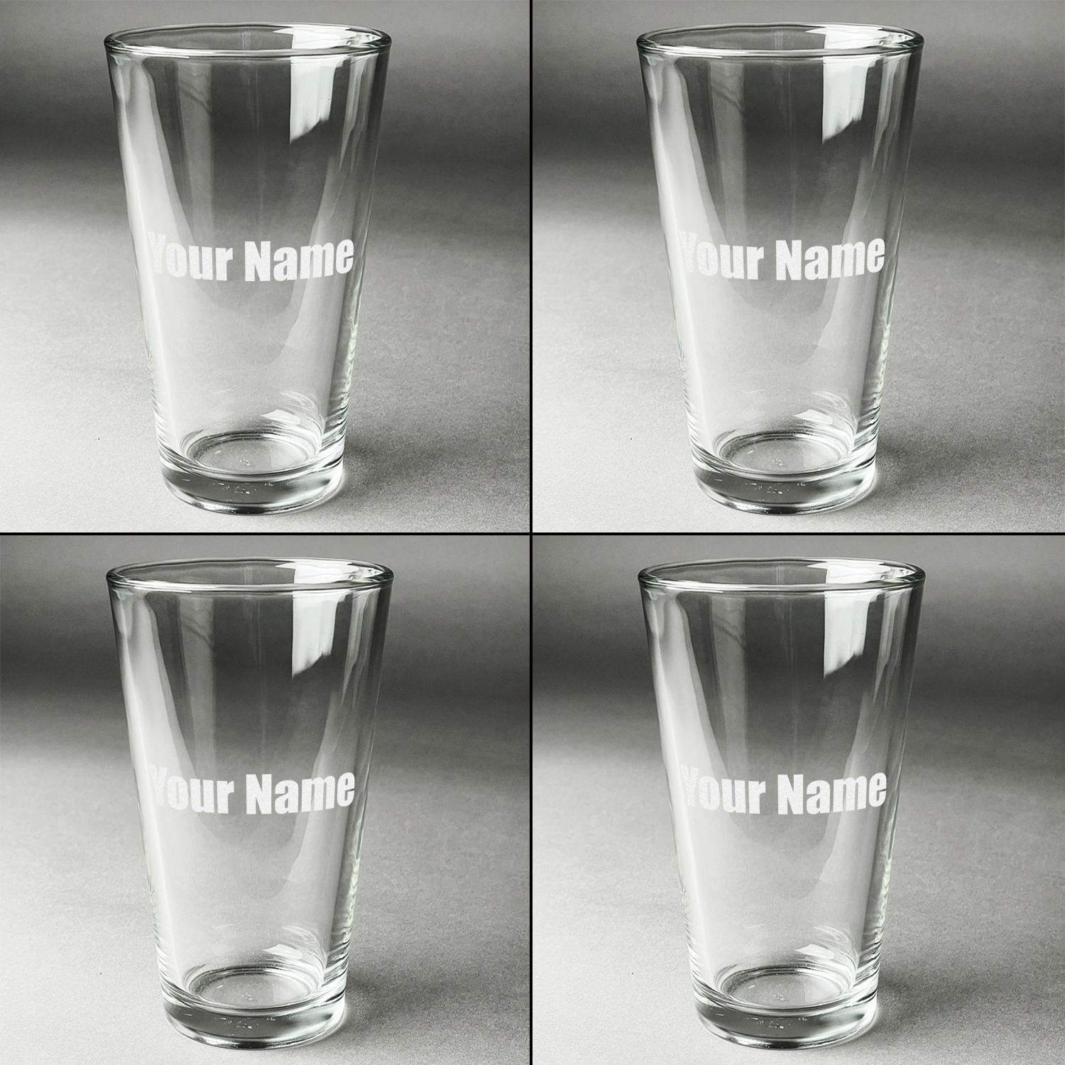 Available in a single glass or a set of 4 - each glass will be custom engraved with your design. Each glass holds 16 oz and measure 5.75"H x 3.5"W.