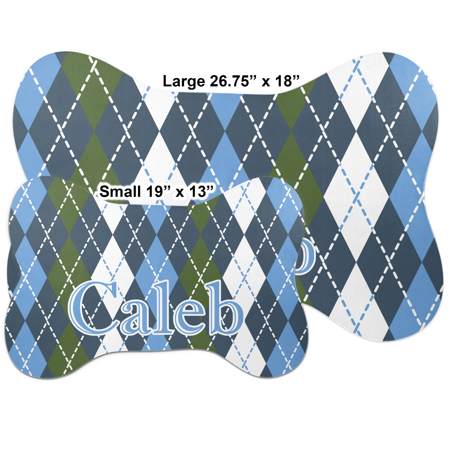 The top of this mat displays your custom design, as it is printed on polyester. To prevent slippage, the underside of the mat is made of rubber. We offer a small dog food mat, suitable for smaller dogs and a large dog food mat for bigger breeds. The small dog food mat is approximately 19 by 13 inches, while the large dog feeding mat measures at approximately 26.75 by 18 inches. Both personalized mats are ideally sized to fit two dog bowls.