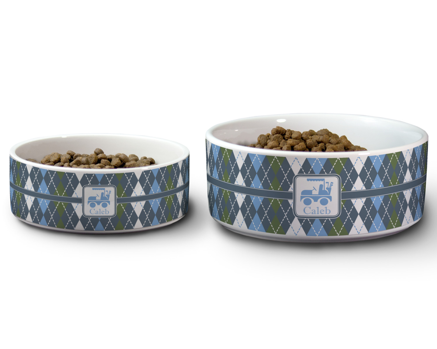 We carry these custom dog bowls in two available sizes: medium and large.The medium is 6 inches in diameter and 2.5 inches tall, and can therefore suit pets who eat up to 2.5 cups of food per meal. The large pet bowl is 7 inches in diameter and 3 inches tall, and suits pets who require up to 4.5 cups of food per meal.