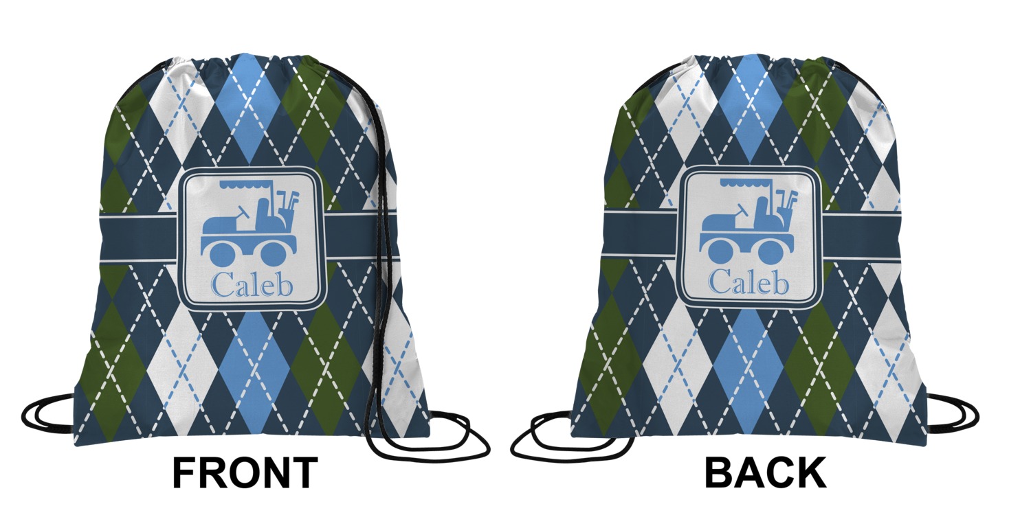 Your custom design will appear on the front and the back of the backpack. You can customize each side individually. The inside of the backpack is white and the drawstrings are black. The back pack is made of 100% polyester fabric.