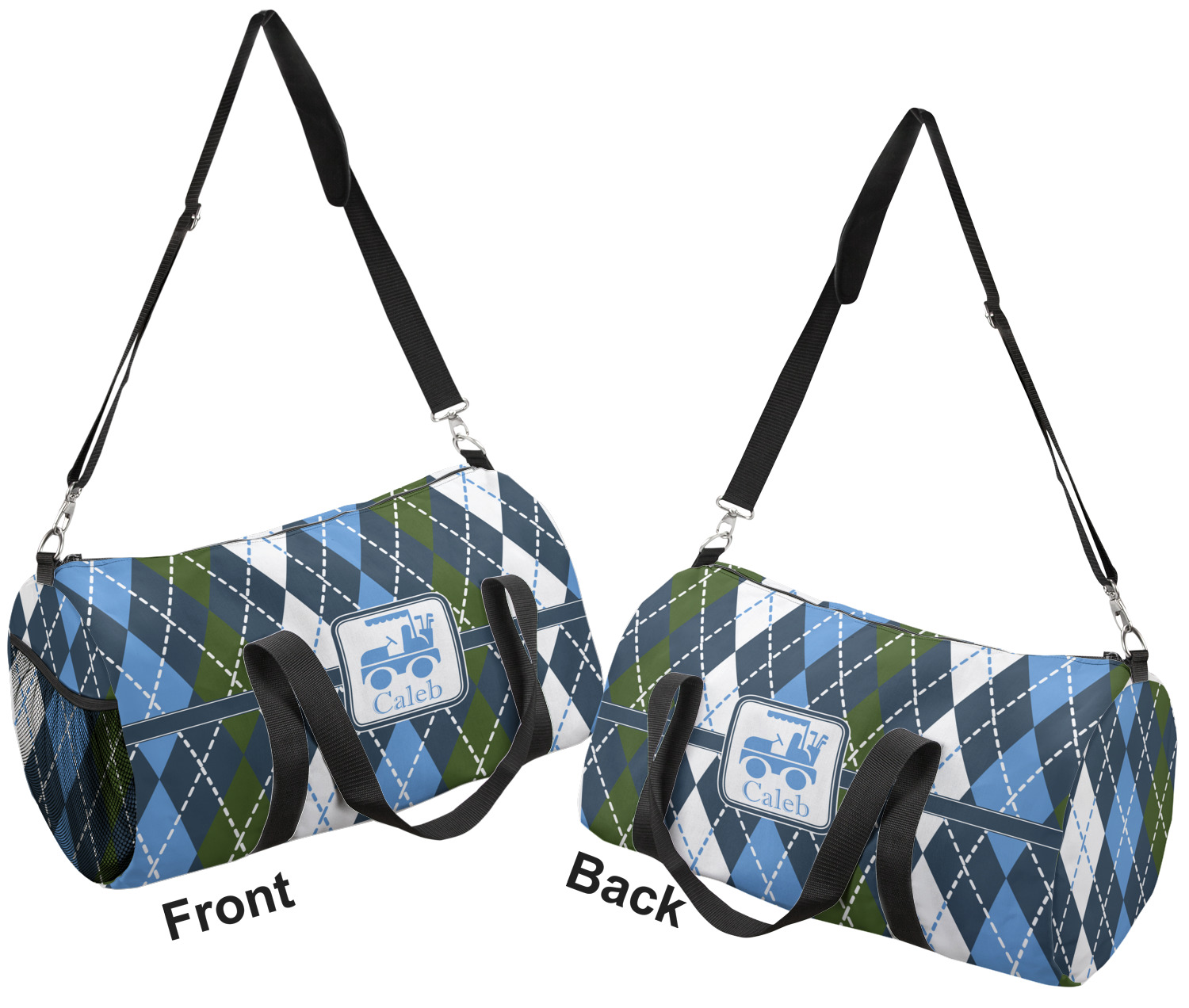 This duffle is a sturdy bag made of a canvas material. It comes in two sizes: Small (19"W x 9.5"H x 9.5"D) and Large (23"W x 12"H x 12"D). The bag is a cylindrical shape with a black adjustable strap and two handles. On one side is an elastic pouch to put a waterbottle or other small item. Your product will be sublimated with your design and is able to be designed on the front, back, and sides. Be sure to remember that the straps may cut into parts of your design if you upload your own artwork.