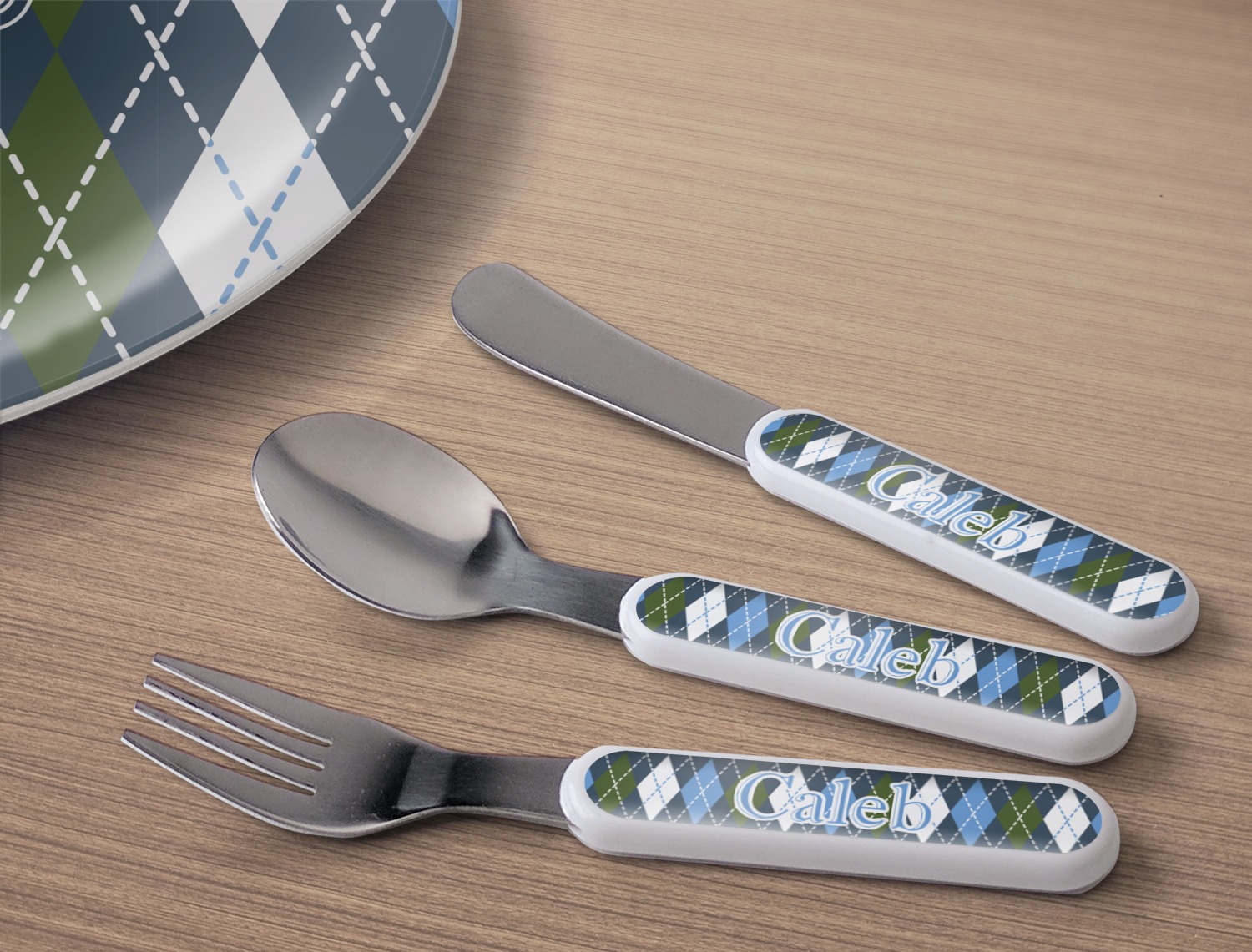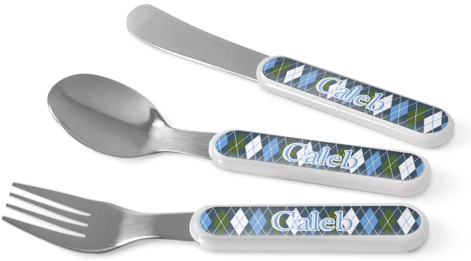 This set of kids' silverware includes a 5.5 inch spoon, fork, and knife, catered to your little one's needs. The prongs of this fork are flat and dull, while our spoon is small enough for tiny mouths, and the dullness of the knife itself resembles a butter knife, at most. These kids' utensils are made of stainless steel, while the handles are crafted from a durable plastic that will withstand the energy and use of your young one. We print your customization across the handles, making the cutlery set unique to your child only.