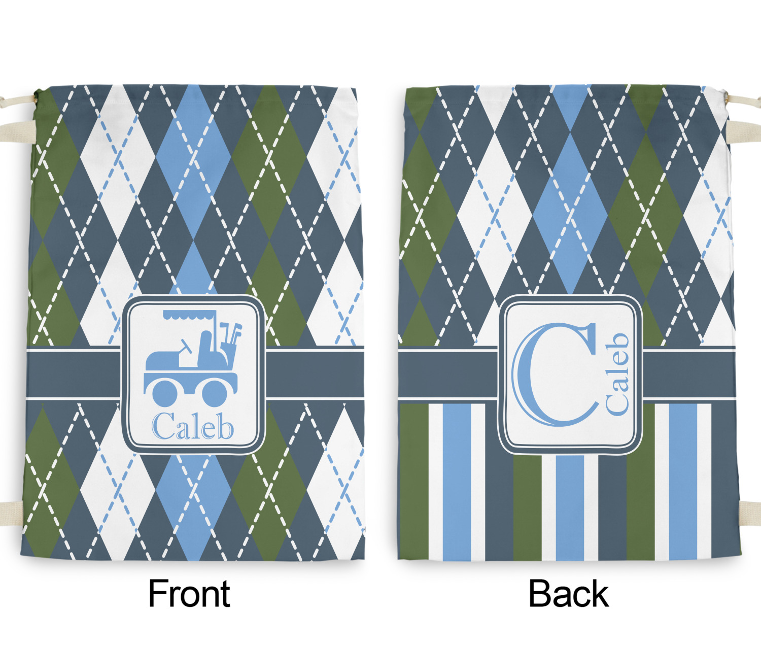 Carry your laundry in style with these customized laundry bags. Available in two sizes, featuring a natural colored woven strap and a cinch cord, these bags hold a lot of clothes or anything else you want to fit in them.