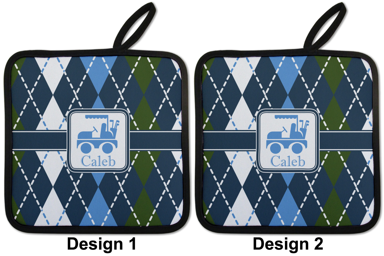 Our personalized pot holders feature a neoprene front that displays your personalization in vibrant colors. The backing of the hot pot holder is rubberized; the textured backing allows you to have a great grip when using this custom pot holder. The two materials are joined with a sleek, black trim, and the holder also includes an attached loop for hanging and storage. The pot holder is approximately 8.75 inches by 8.75 inches and 0.25 inches tall, while the fabric loop is 2.5 inches long. You can purchase a kitchen pot holder by itself or as a set of 2. We also offer a set including one pot holder and one oven mitt.