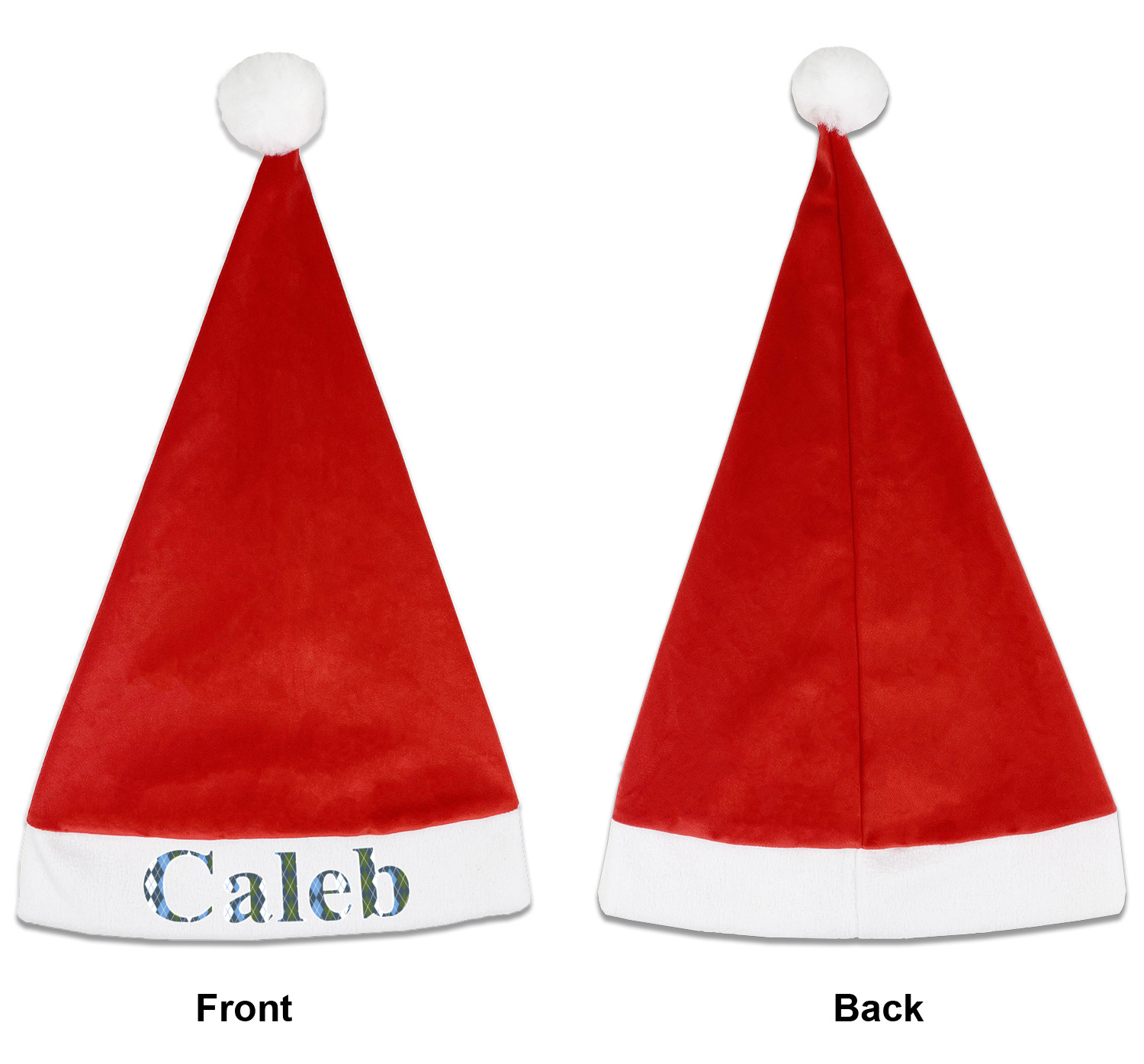 Our Santa hats are a soft, velvety polyester material. These customizable Santa hats are a classic red with white brimming and pom pom ball hanging off the hat tail just like Santa Claus! Each personalized Santa hat is approximately 17.5 L x 11.8 W. We offer two different styles to print your designs on the white brim - front or front & back.