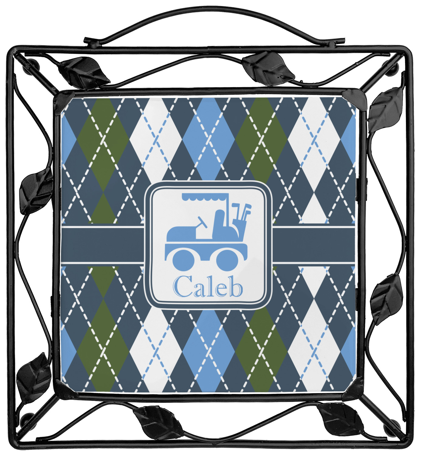 Our square trivets are made from a durable, wrought iron. This model features 4 small half circles, one on each corner, and a larger ring of iron that circles the central, customized tile. Each of the 4 corners has a round foot on its bottom for stability. This trivet is 8.75 by 8.75 inches, but the central tile measures at 6 inches on both sides.