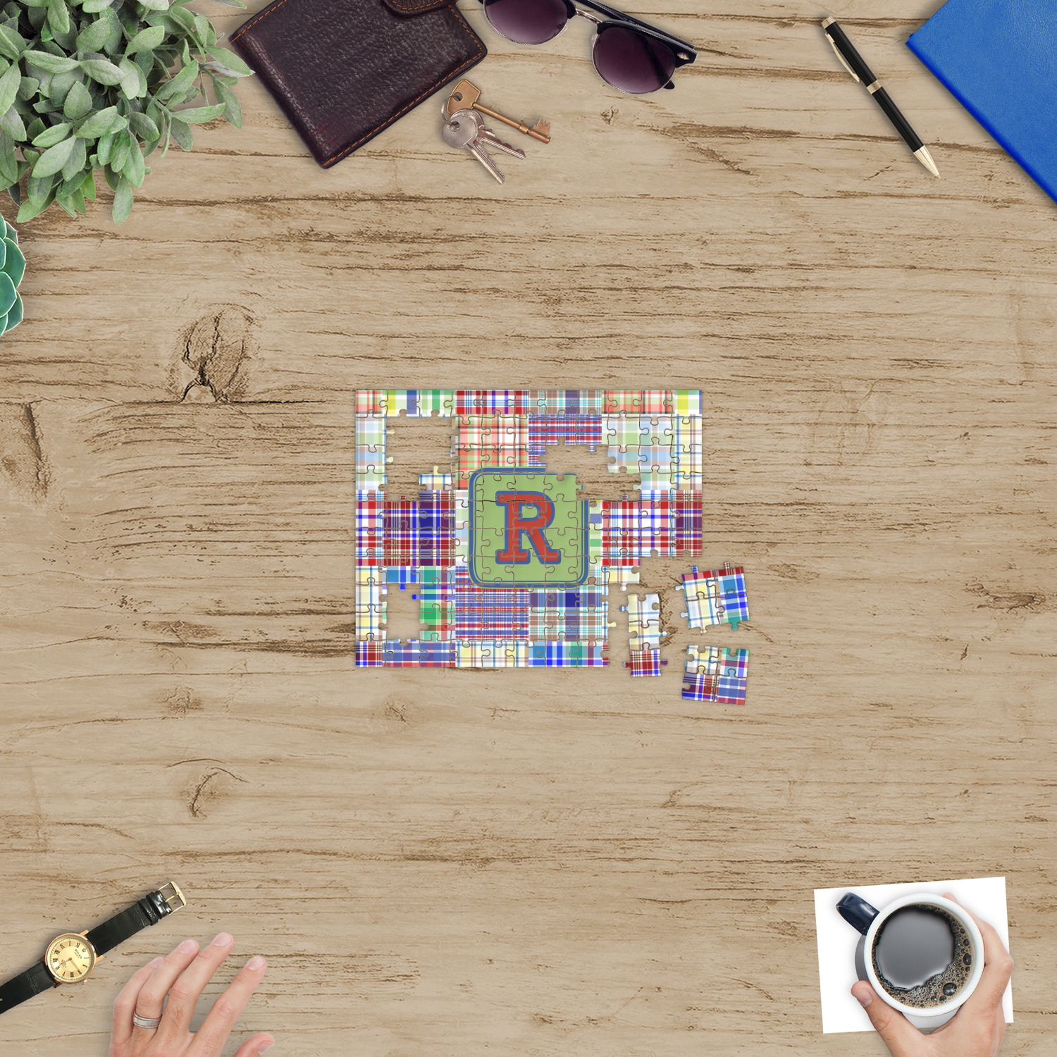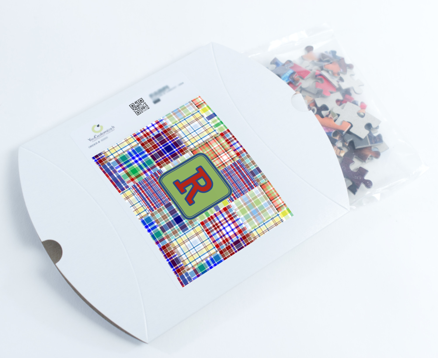 A square label is the perfect place for your initial, to make this collection of plaids truly you.