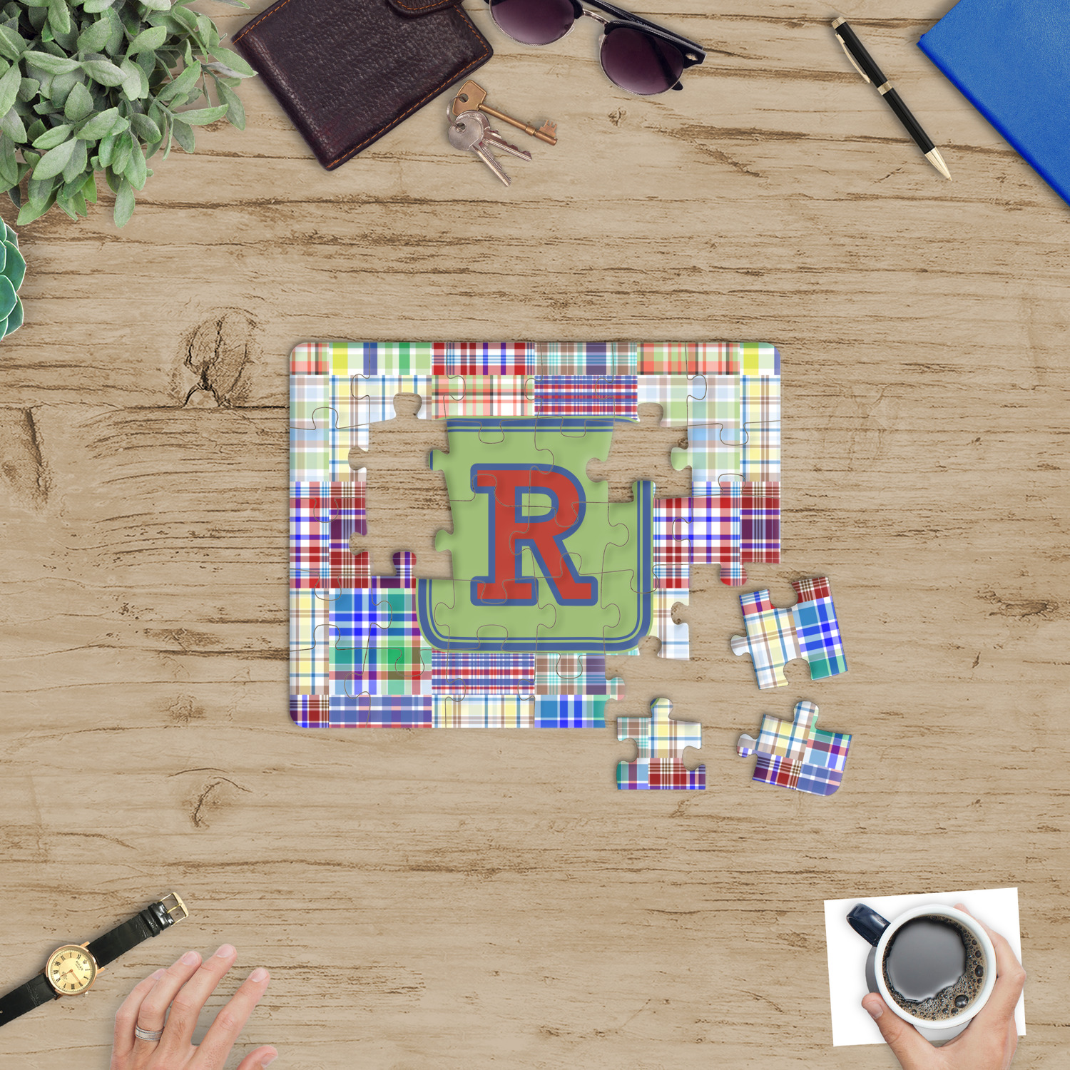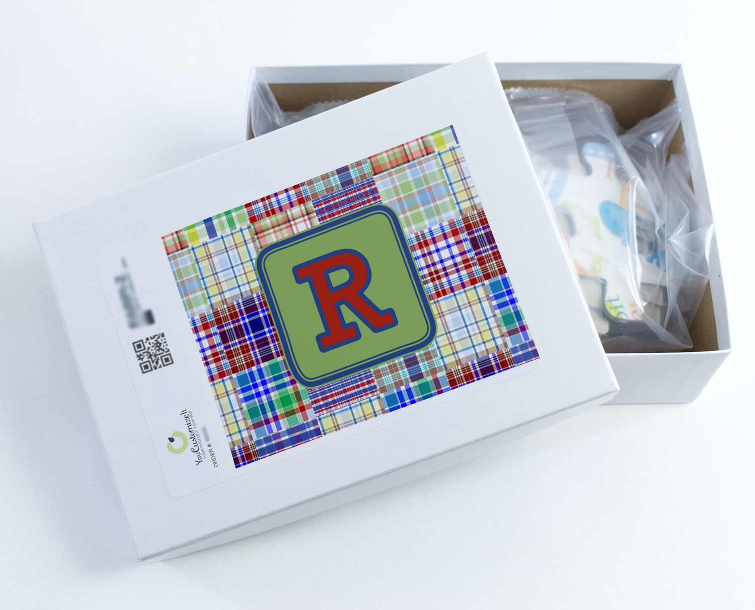 A square label is the perfect place for your initial, to make this collection of plaids truly you.