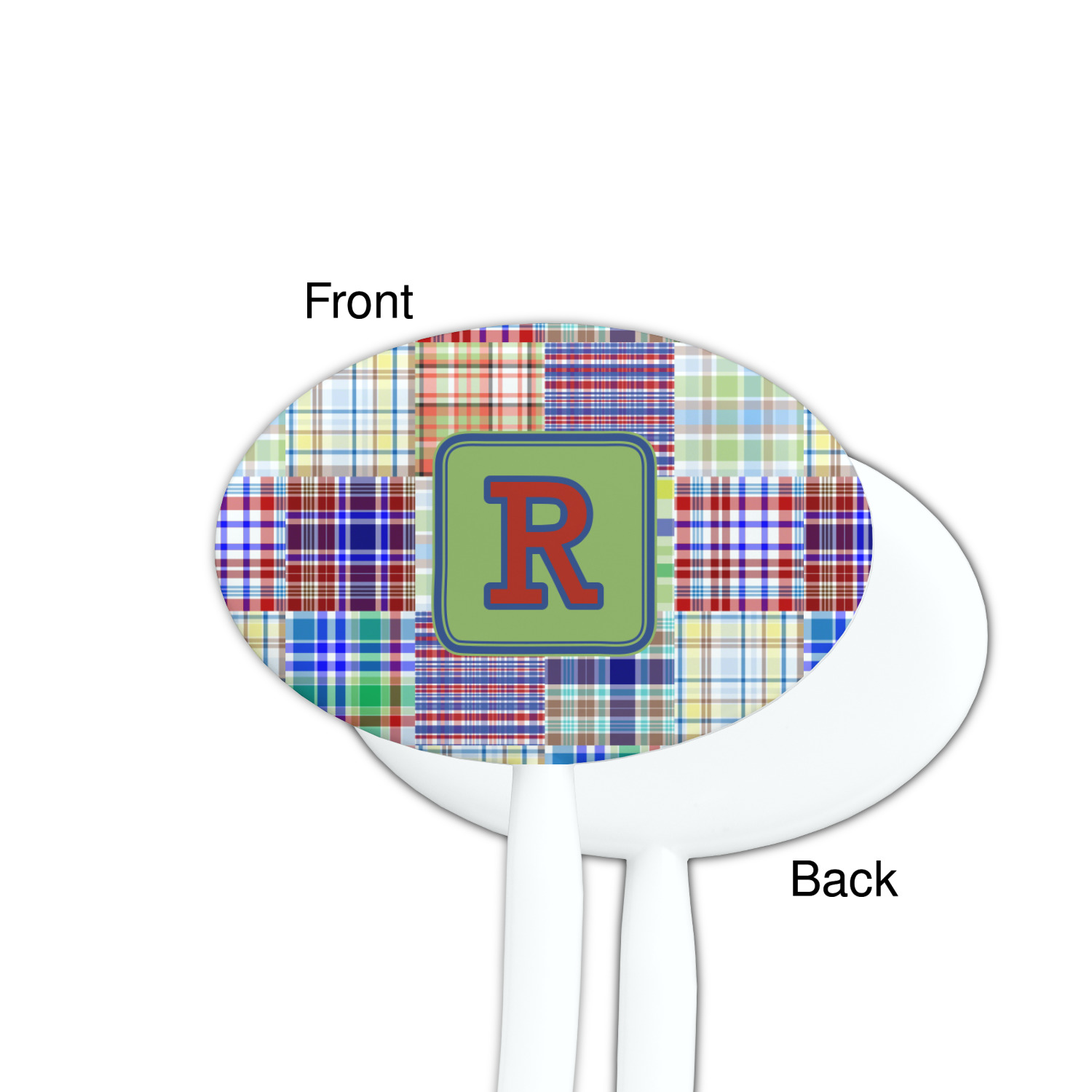 A square label is the perfect place for your initial, to make this collection of plaids truly you.