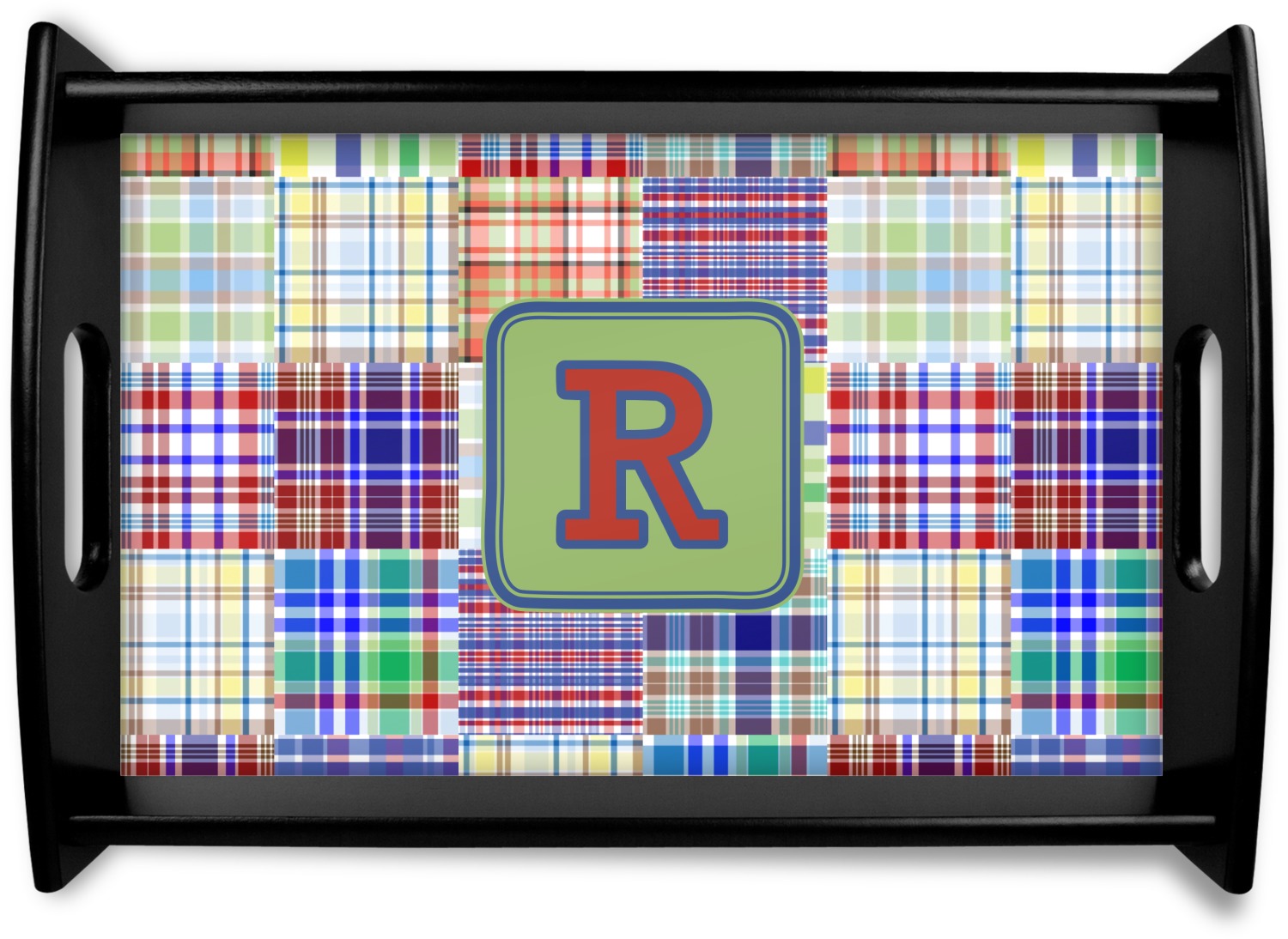 A square label is the perfect place for your initial, to make this collection of plaids truly you.