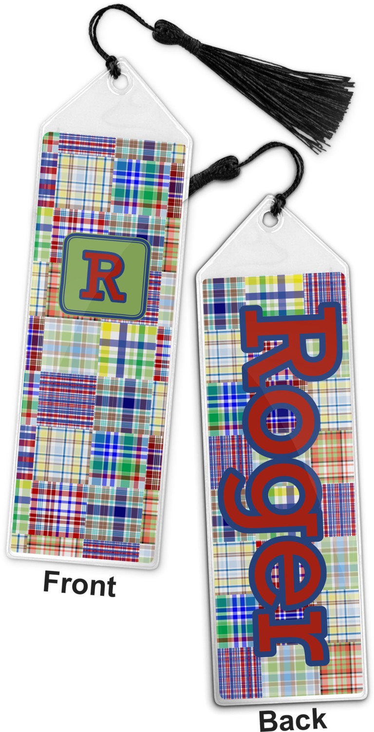 Your personalized bookmark is made of a sturdy, clear vinyl, and is approximately 7.5" x 2.25". We display your personalization on vinyl inserts that are placed on both sides. Accompanying each book marker is a black, fringe tassel that attaches to the reinforced, triangular header.