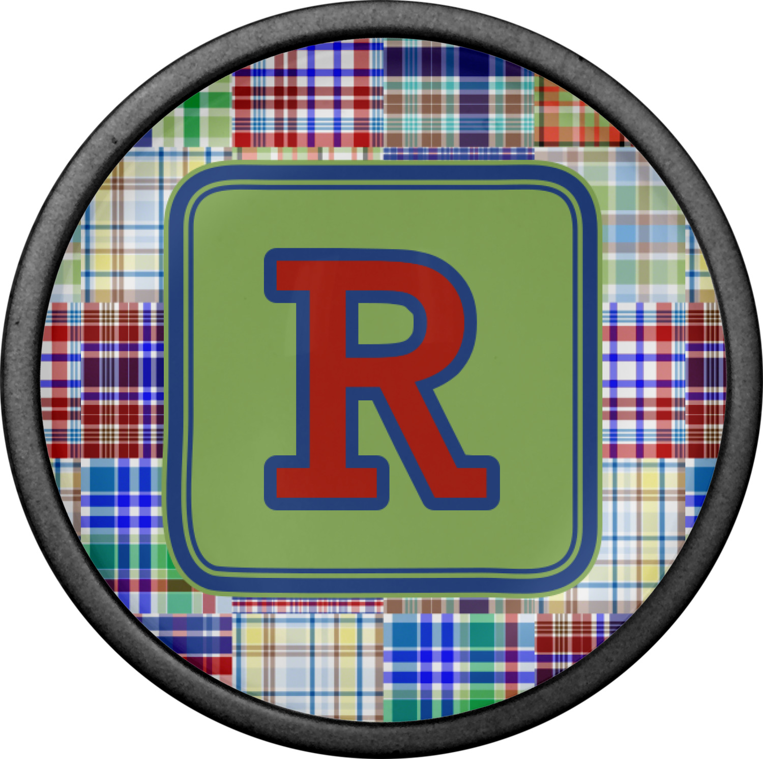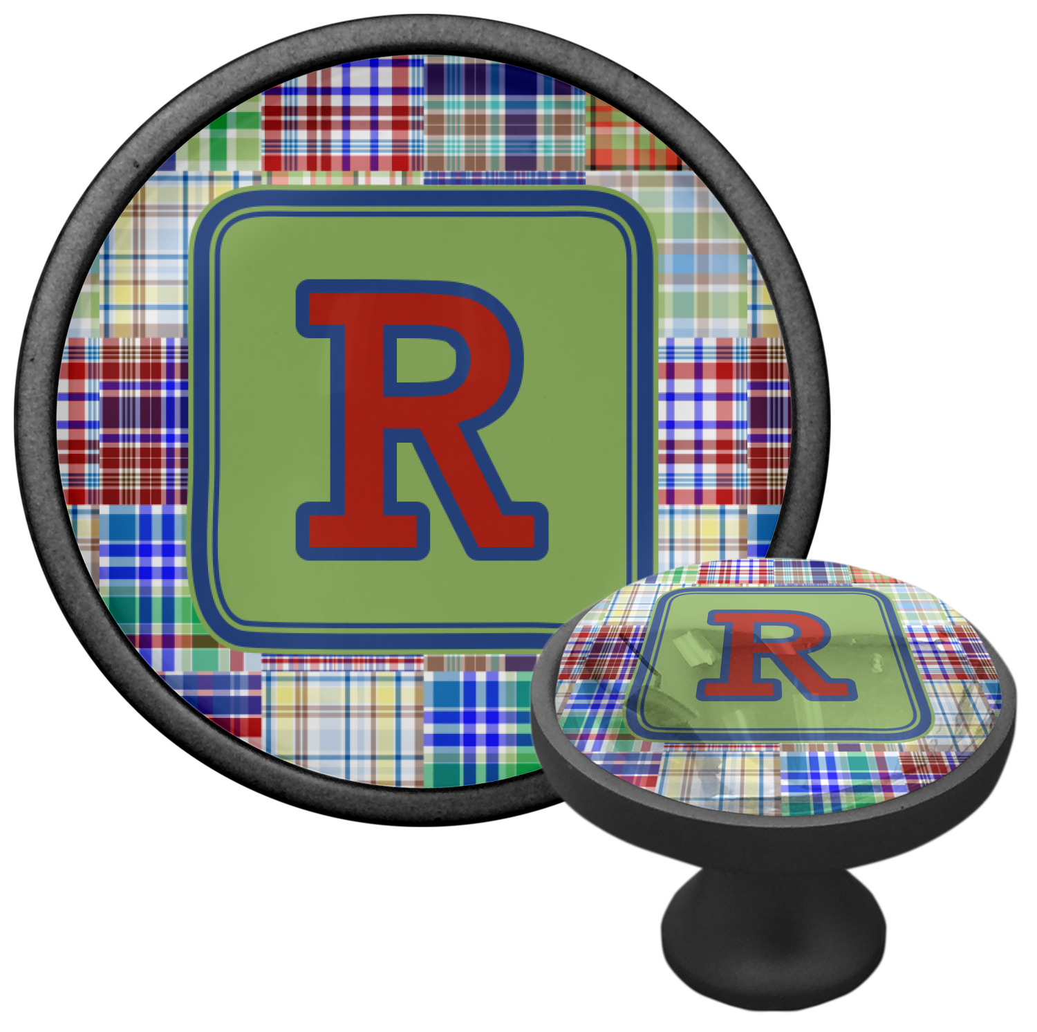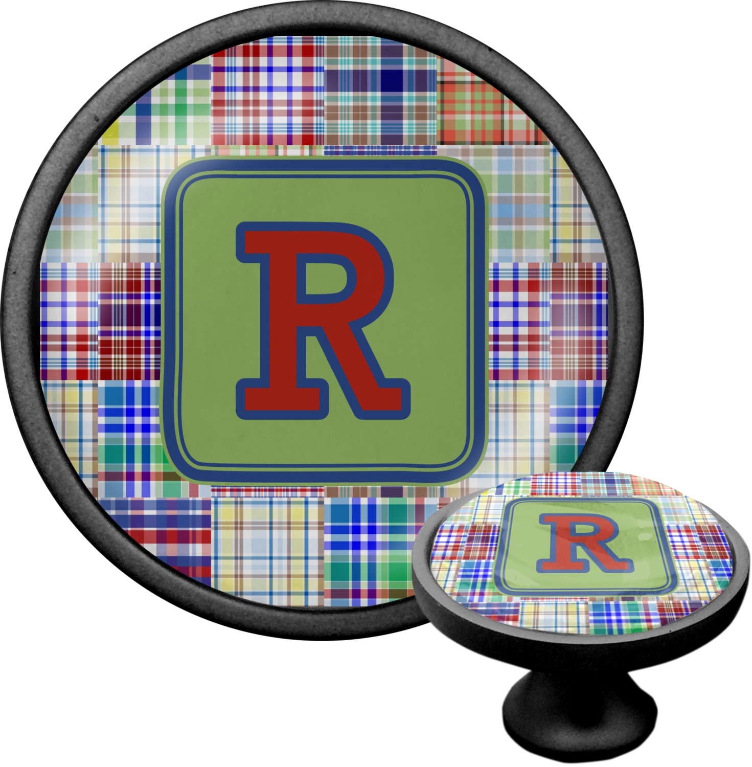 A square label is the perfect place for your initial, to make this collection of plaids truly you.