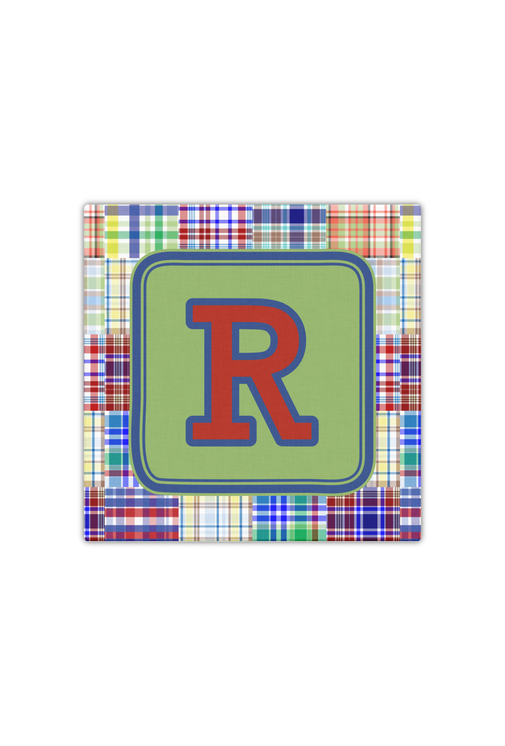 A square label is the perfect place for your initial, to make this collection of plaids truly you.
