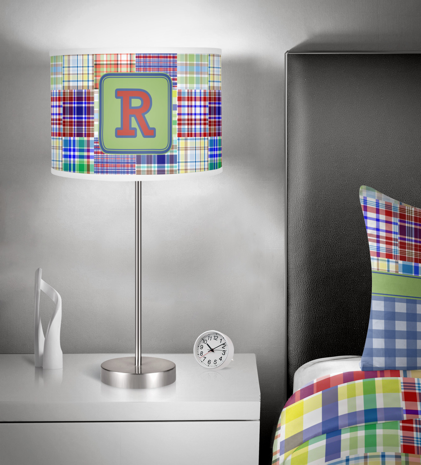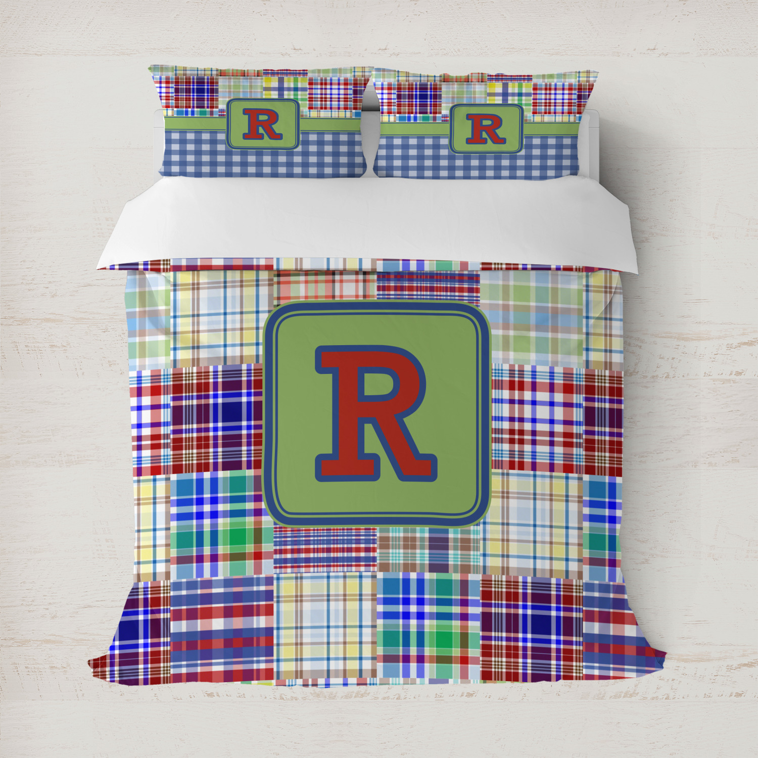 A square label is the perfect place for your initial, to make this collection of plaids truly you.