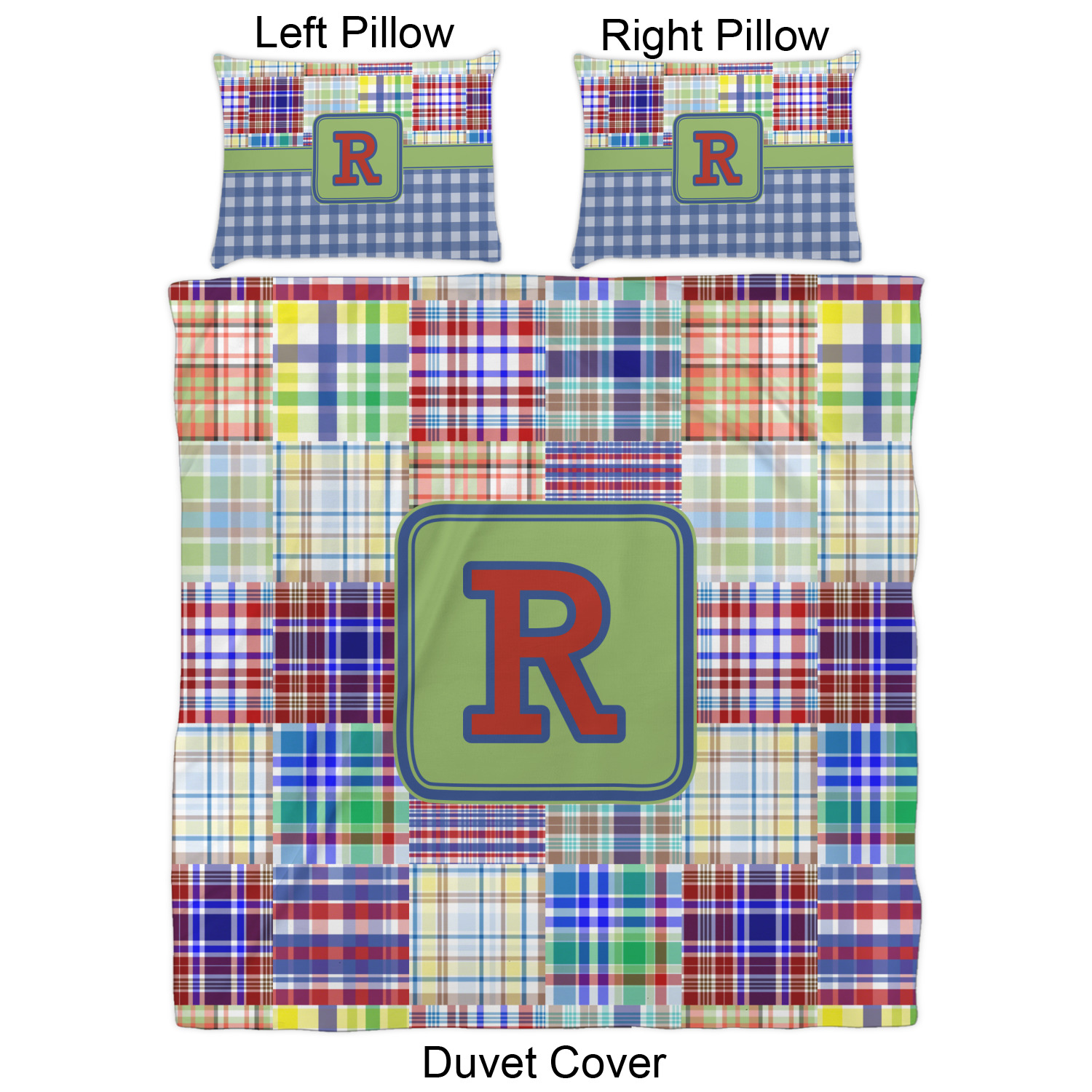 A square label is the perfect place for your initial, to make this collection of plaids truly you.
