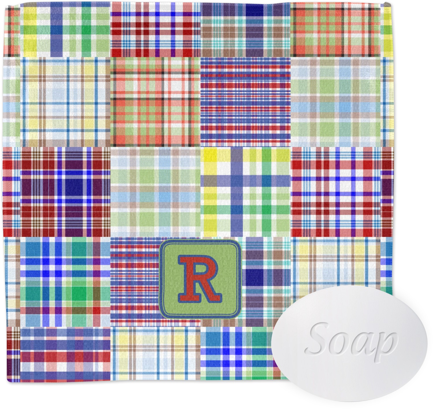 A square label is the perfect place for your initial, to make this collection of plaids truly you.